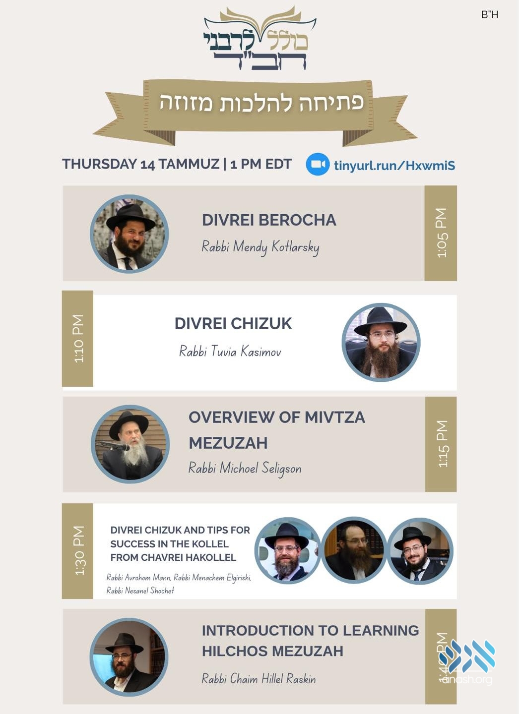 As Kollel L’Rabbonei Chabad starts the sugya of Hilchos Mezuzah for their summer zman, they invite the community of shluchim and anash to their introductory shiur, including a special presentation by Rabbi Michoel Seligson on mivtza mezuzah.