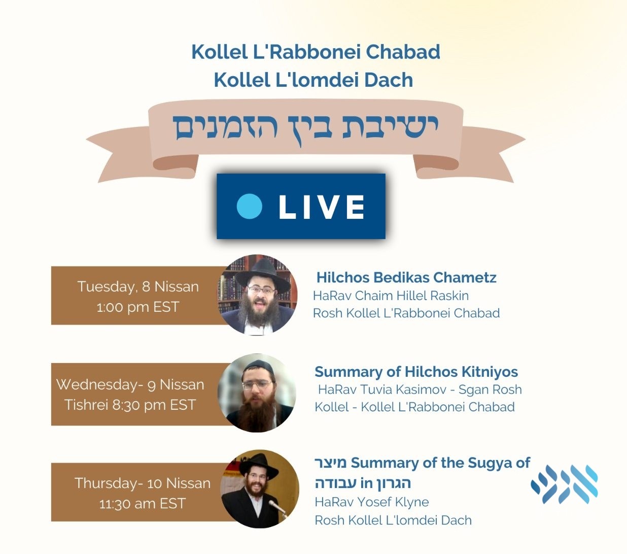 The series begins on 8 Nissan at 1:00 pm EST with a shiur on Hilchos Bedikas Chametz by Rabbi Chaim Hillel Raskin, Rosh Kollel L’Rabbonei Chabad.