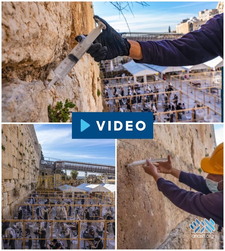 Amid Israel’s latest lockdown, pre-Pesach conservation work began at the Kosel on Monday, using injections with the aid of syringes very similar to those used by medical staff.