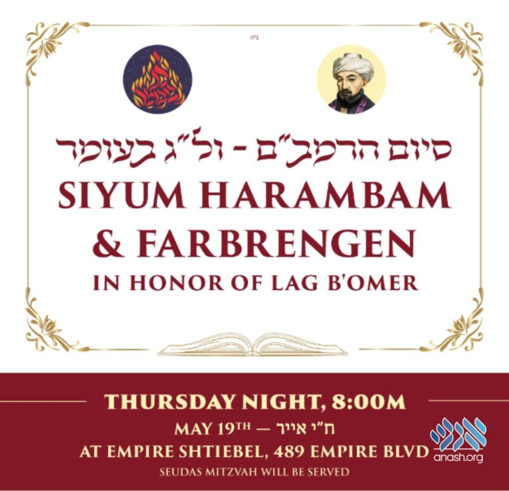Irgun Torah invites the community to a farbrengen and seudas mitzvah in honor of Lag B’omer and the Siyum HaRambam which will take place Thursday 8:00pm, at the Empire Shtiebel.