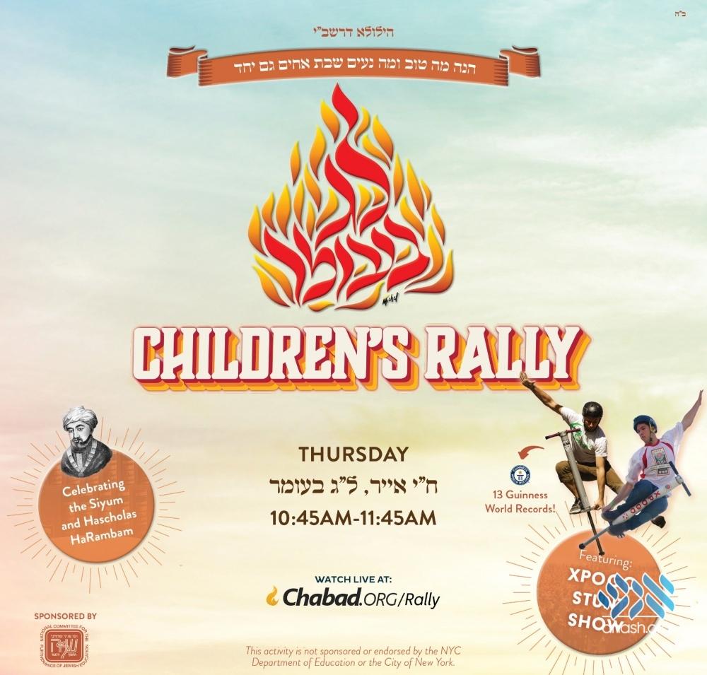 The Rebbe encouraged everyone to celebrate the Siyum HaRambam, including children. The annual children’s rally organized by NCFJE will feature children making a Siyum on the Rambam’s Sefer HaMitzvos.