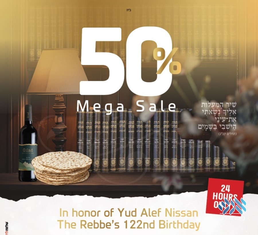 Tonight and tomorrow, the night and day of Yom Habohir 11 Nissan, the 122nd birthday of the Rebbe’s, a huge discount is being held, on behalf of the publishing house of the Rebbe’s Torah, ‘Vaad Hanochos BeLahak’.