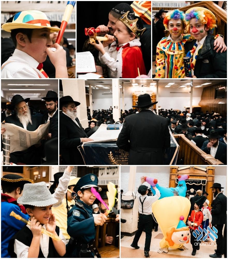 Hundreds gathered in the main shul of 770 for the first Megillah reading of Purim 5781, with children dressed up in creative and colorful costumes.