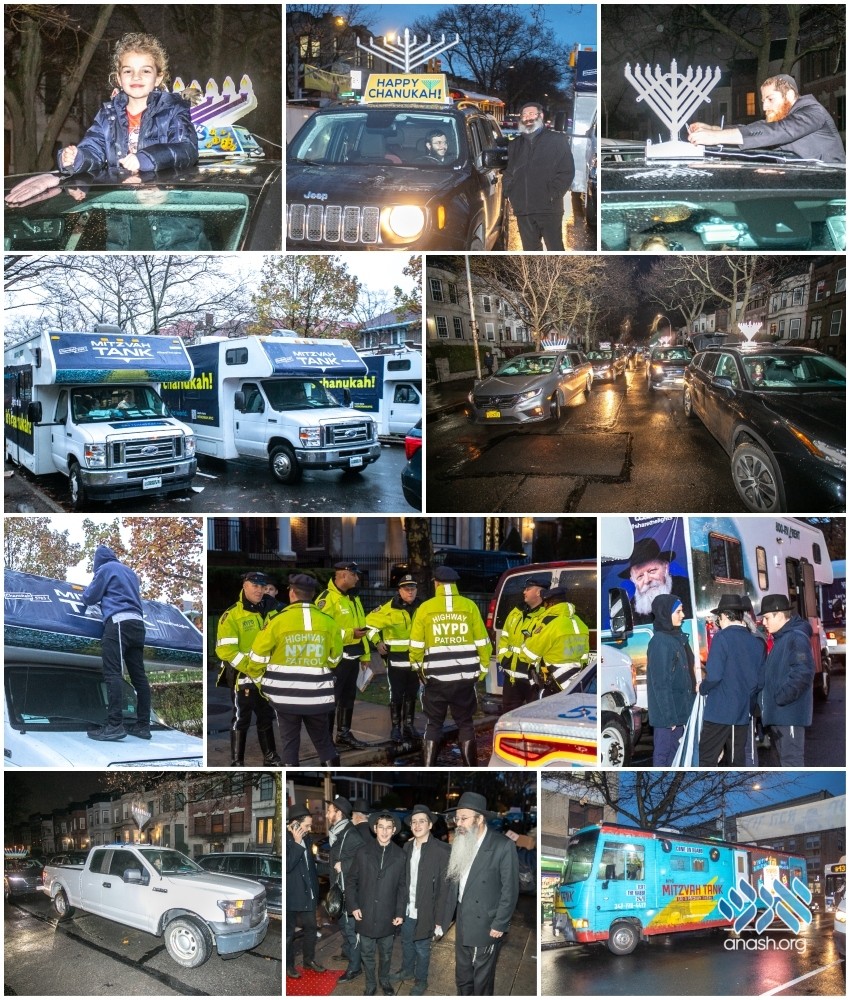 Over 250 cars of all sizes topped with car menorahs, accompanied by nearly 50 mitzvah tanks, departed from Crown Heights for the world’s largest Chanuka menorah parade.