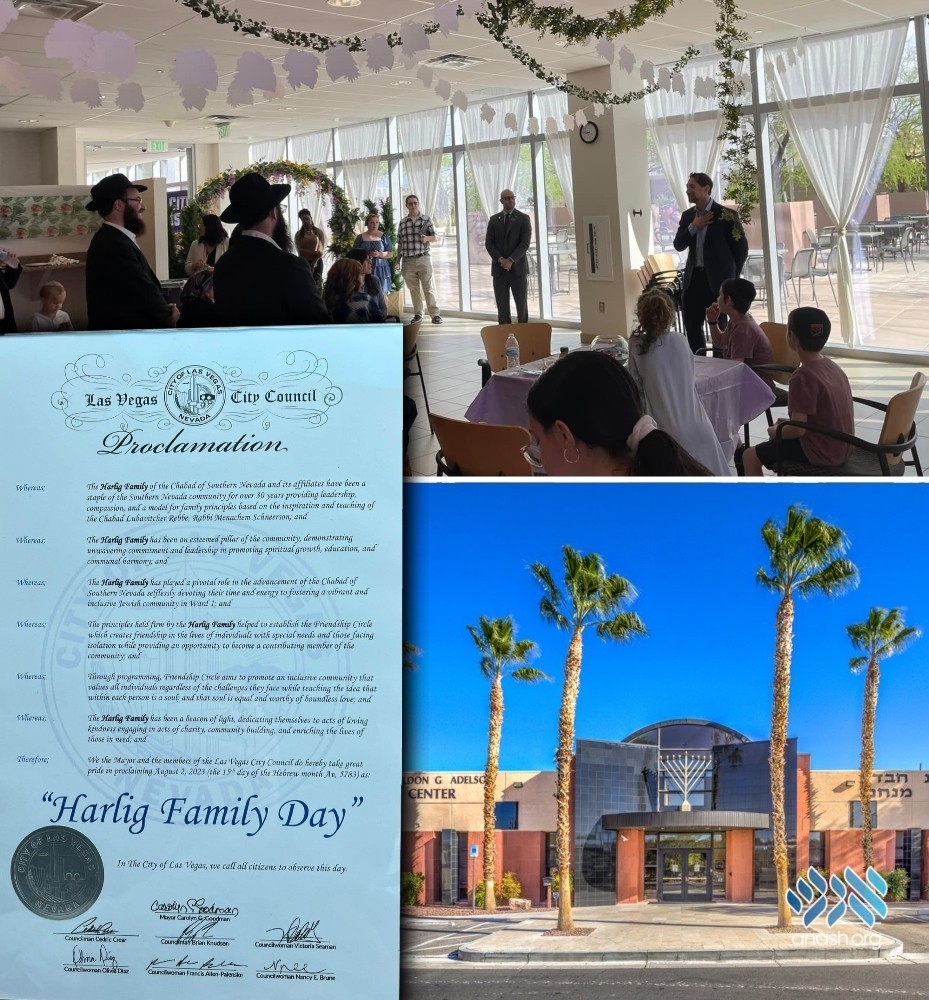 Las Vegas paid a unique tribute to Rabbi Shea and Dina Harlig, head shluchim of Southern Nevada and their family, with a declaration proclaiming August 2nd 2023 – 15 Av 5783 as “Harlig Family Day” in the city.