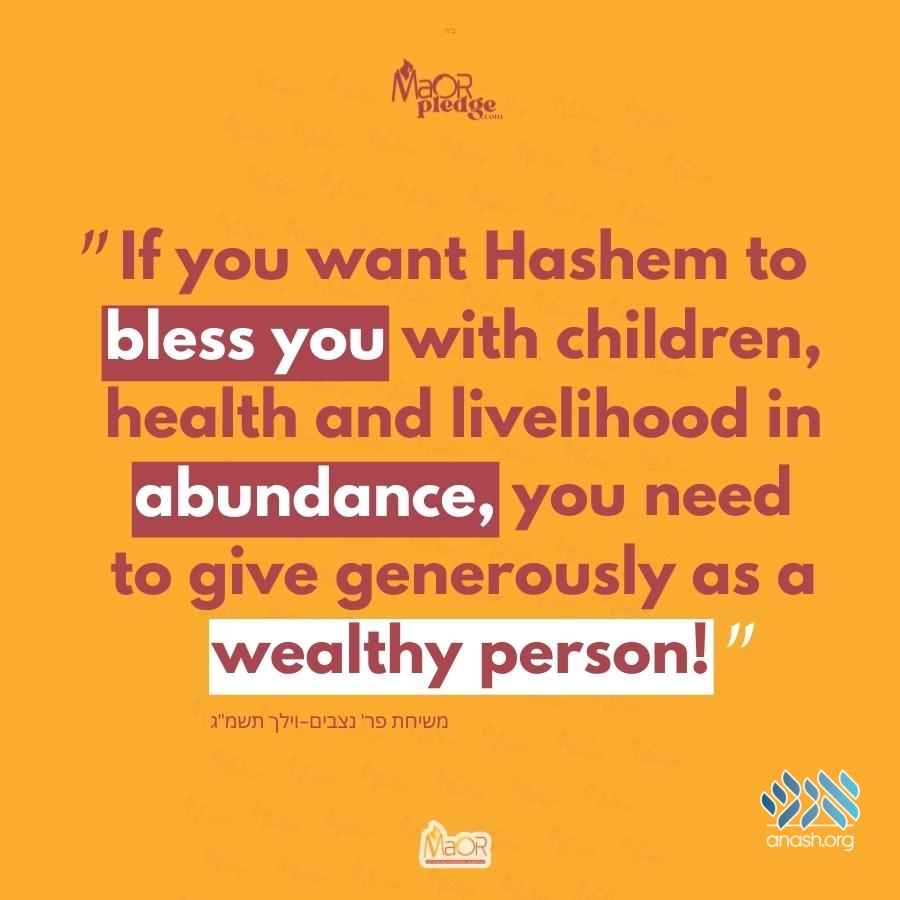 If you desire Hashem’s abundant Brocha of children, health, and livelihood, consider making a monthly pledge to Tzedakah based on the Rebbe’s guidance. The Rebbe’s instructions are crystal clear: Write down your pledge, specifying your monthly commitment. By doing so, you not only open a new channel for fulfilling your pledge but also unlock Hashem’s generosity beyond your imagination.