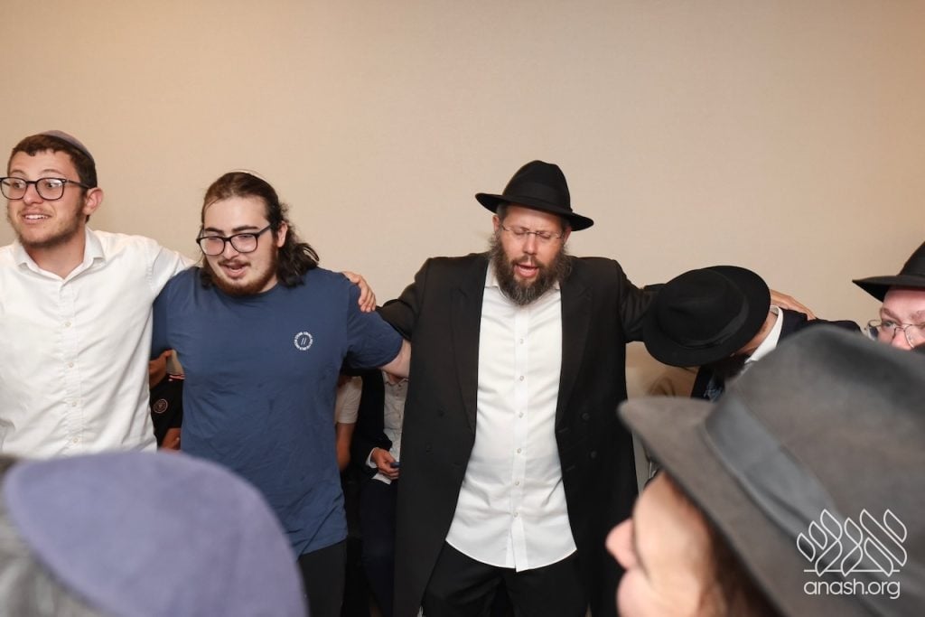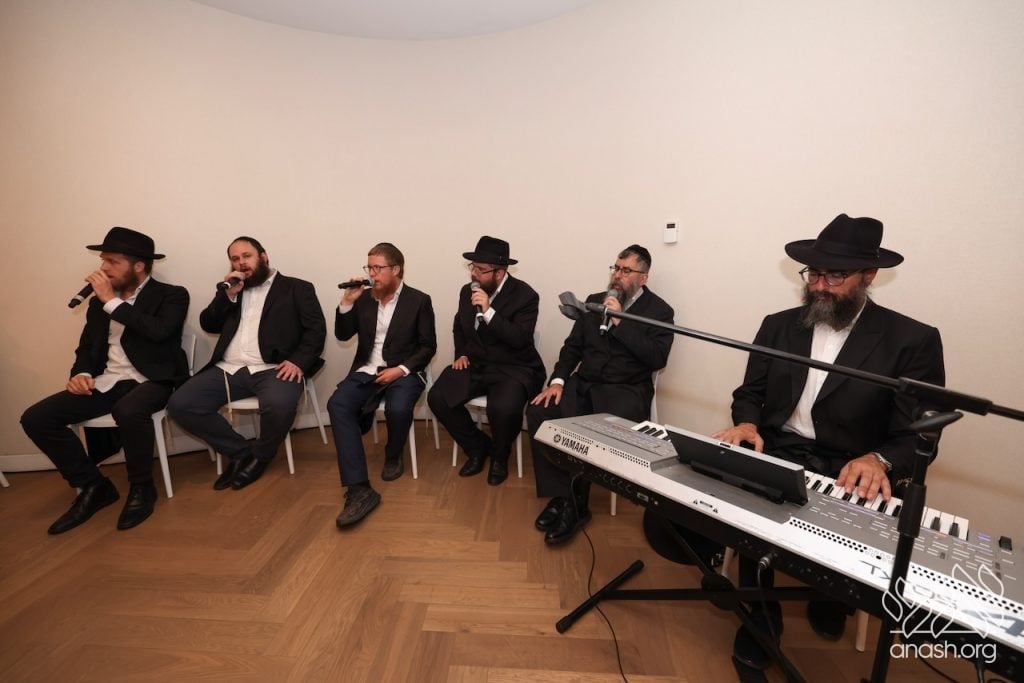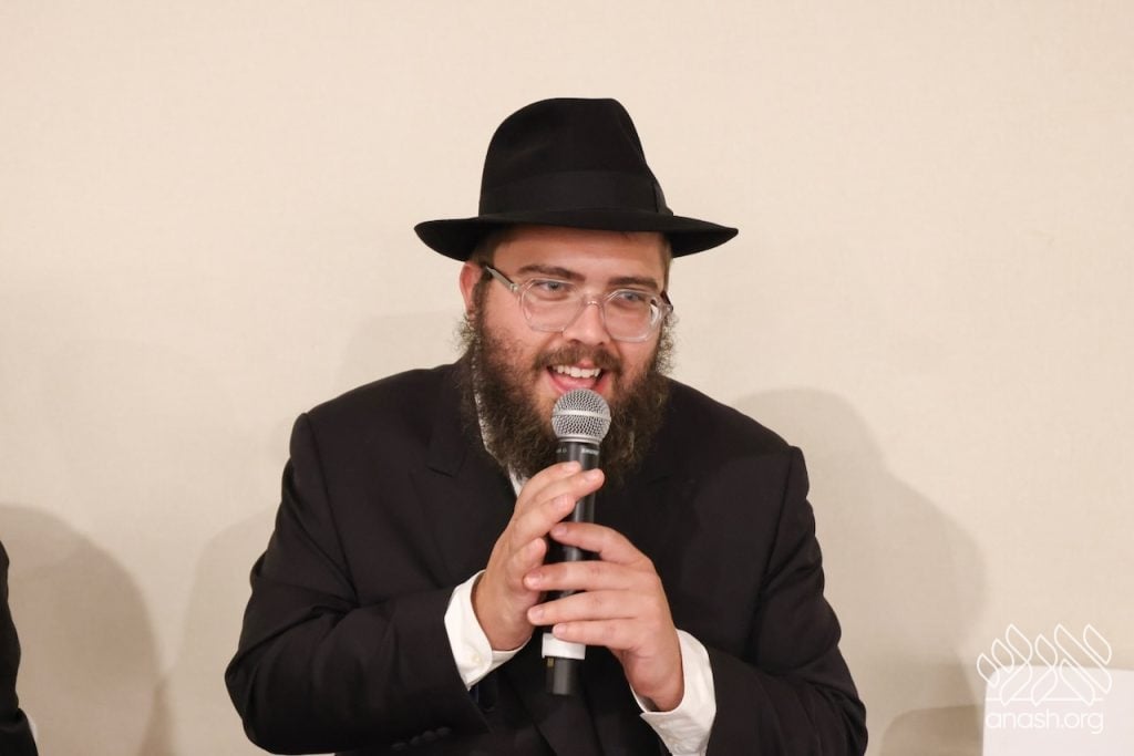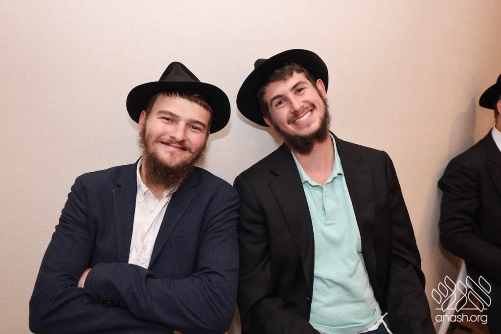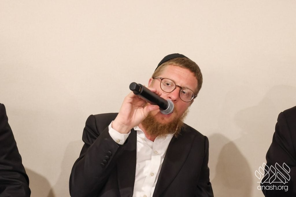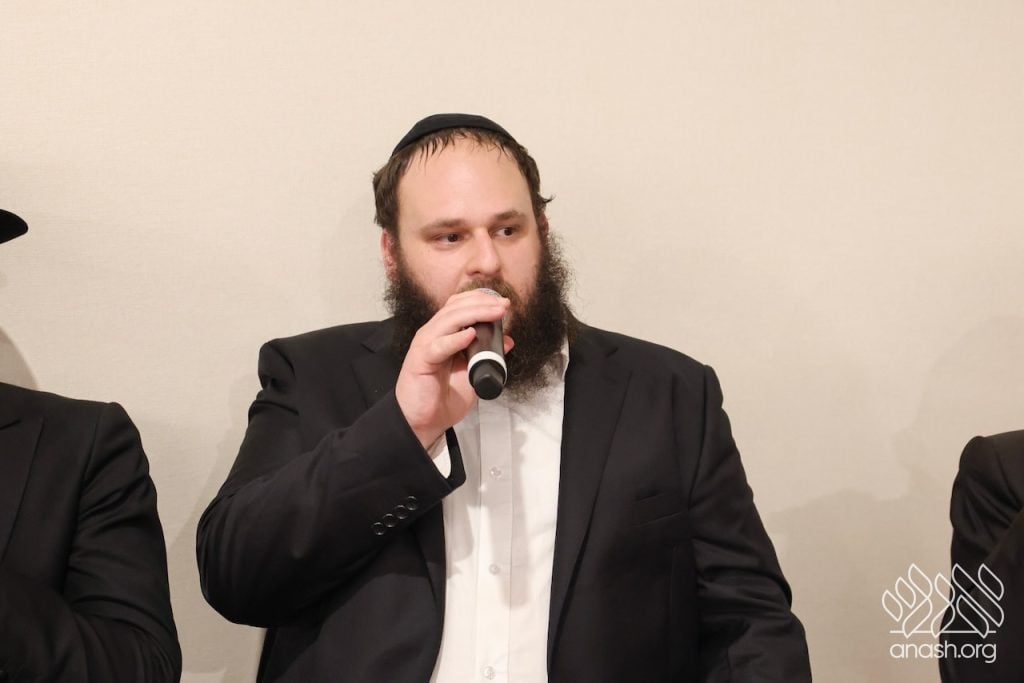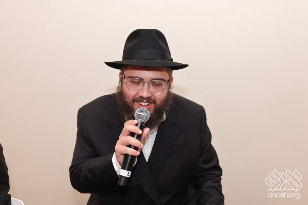 Throughout the evening, the Mezamrim Choir enhanced the program with stirring song, featuring Rabbi Yehoshua Niasoff, Rabbi Yehuda Niasoff, Rabbi Chaim Koncepolski, Rabbi Noach Koncepolski, Rabbi Meir Vilenkin, and Rabbi Menachem Feldman. Each, a respected chazan in his own right, and together they brought extraordinary joy, song, and dancing to the farbrengen, particularly among the bochurim shluchim in attendance.