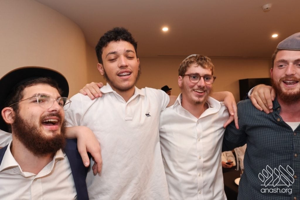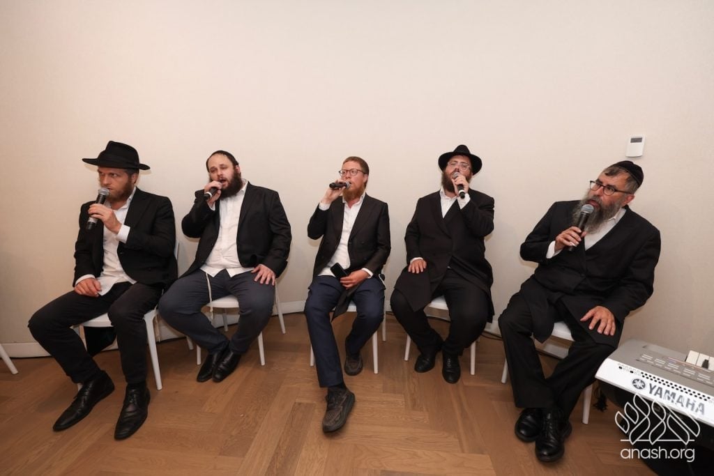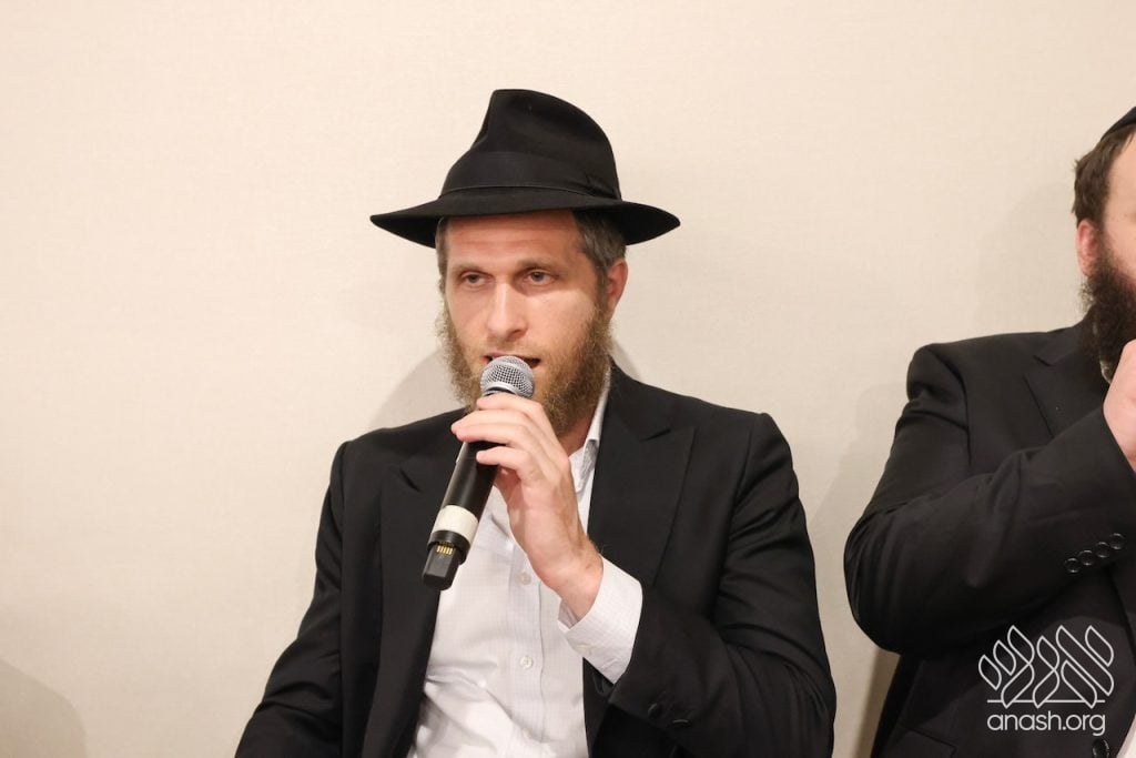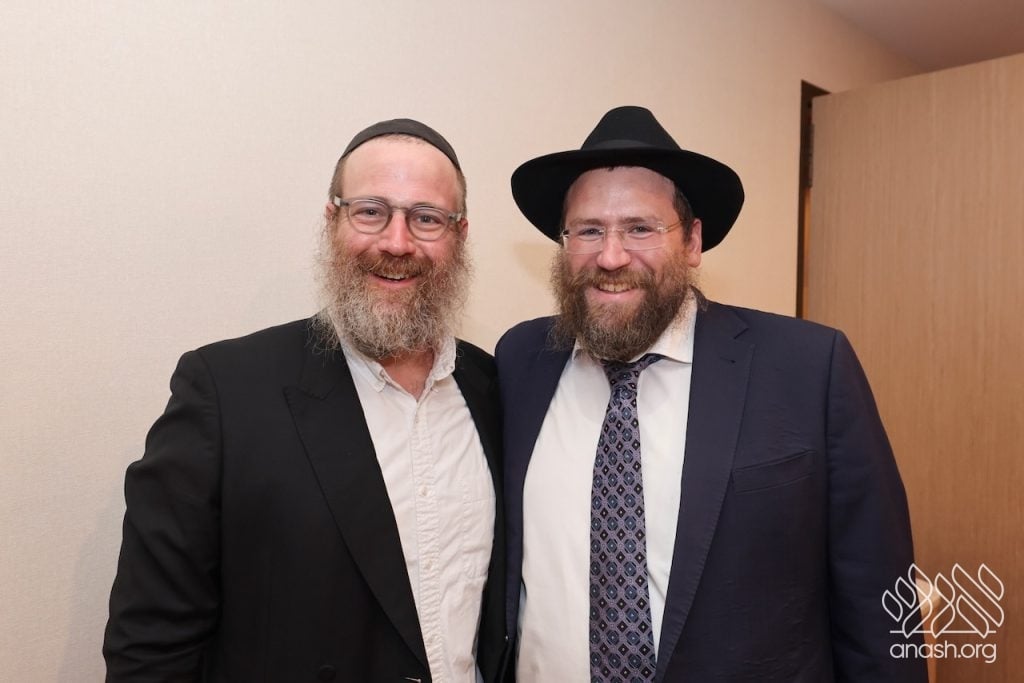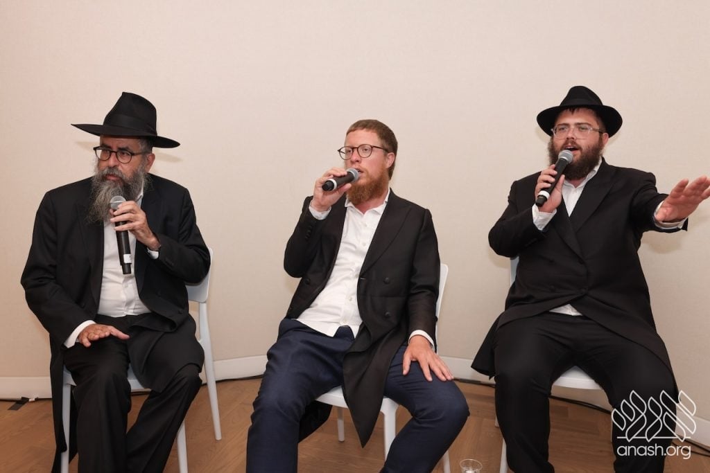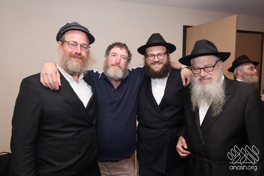 Throughout the evening, the Mezamrim Choir enhanced the program with stirring song, featuring Rabbi Yehoshua Niasoff, Rabbi Yehuda Niasoff, Rabbi Chaim Koncepolski, Rabbi Noach Koncepolski, Rabbi Meir Vilenkin, and Rabbi Menachem Feldman. Each, a respected chazan in his own right, and together they brought extraordinary joy, song, and dancing to the farbrengen, particularly among the bochurim shluchim in attendance.