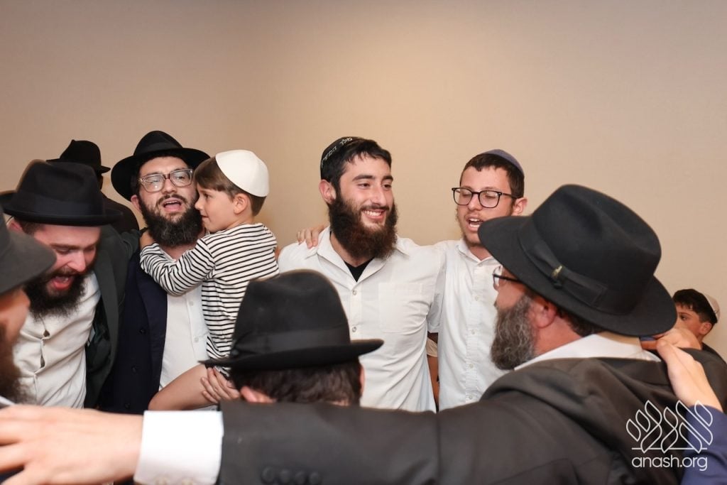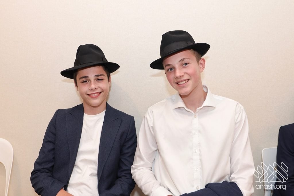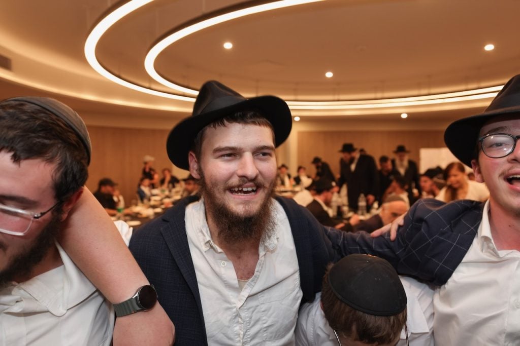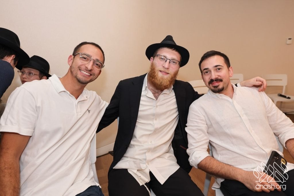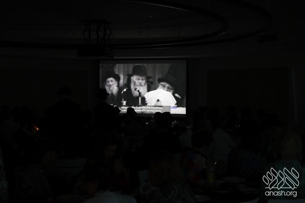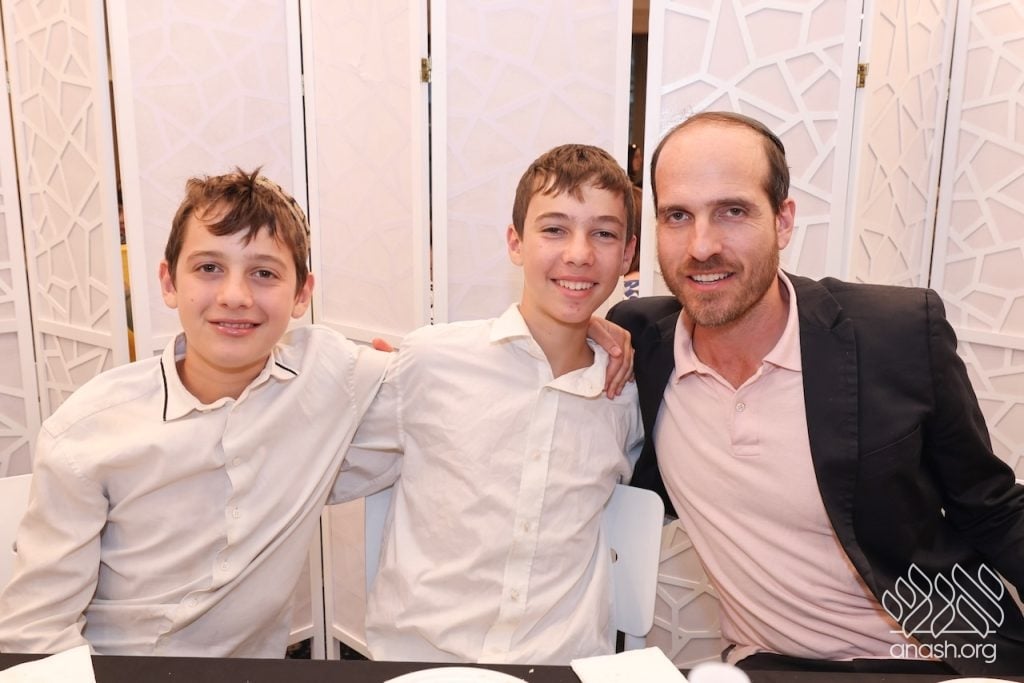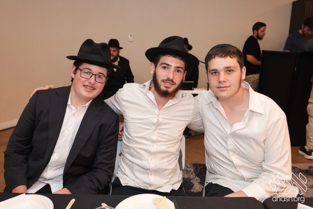 Throughout the evening, the Mezamrim Choir enhanced the program with stirring song, featuring Rabbi Yehoshua Niasoff, Rabbi Yehuda Niasoff, Rabbi Chaim Koncepolski, Rabbi Noach Koncepolski, Rabbi Meir Vilenkin, and Rabbi Menachem Feldman. Each, a respected chazan in his own right, and together they brought extraordinary joy, song, and dancing to the farbrengen, particularly among the bochurim shluchim in attendance.