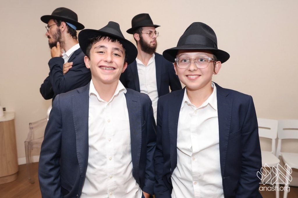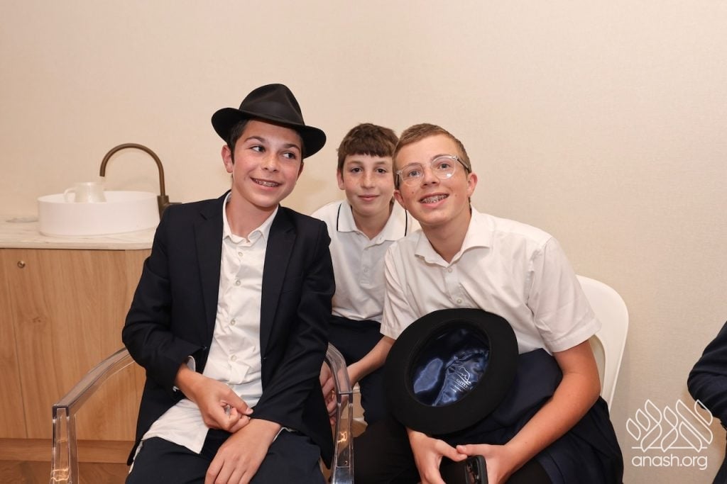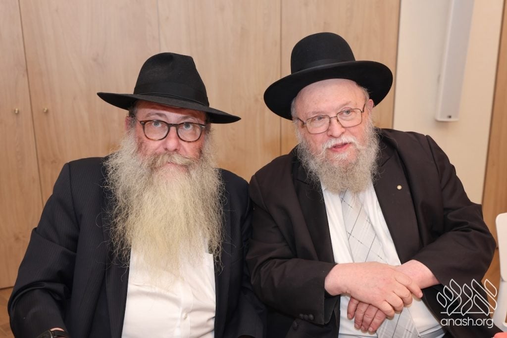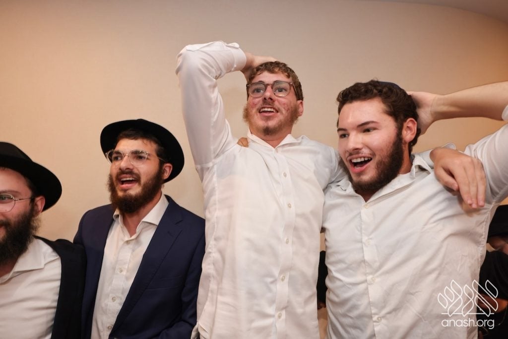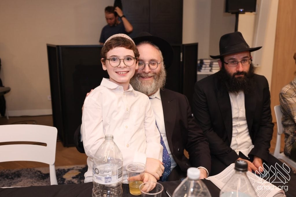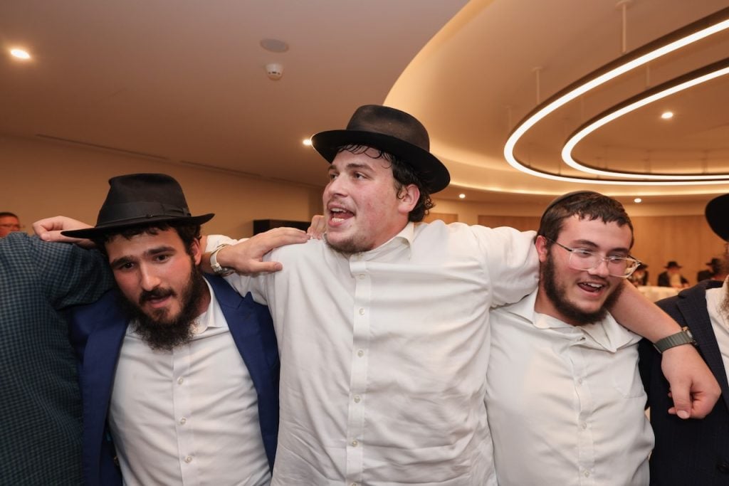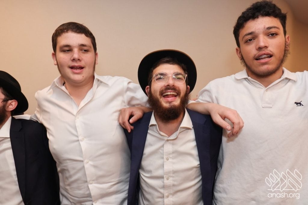 Throughout the evening, the Mezamrim Choir enhanced the program with stirring song, featuring Rabbi Yehoshua Niasoff, Rabbi Yehuda Niasoff, Rabbi Chaim Koncepolski, Rabbi Noach Koncepolski, Rabbi Meir Vilenkin, and Rabbi Menachem Feldman. Each, a respected chazan in his own right, and together they brought extraordinary joy, song, and dancing to the farbrengen, particularly among the bochurim shluchim in attendance.