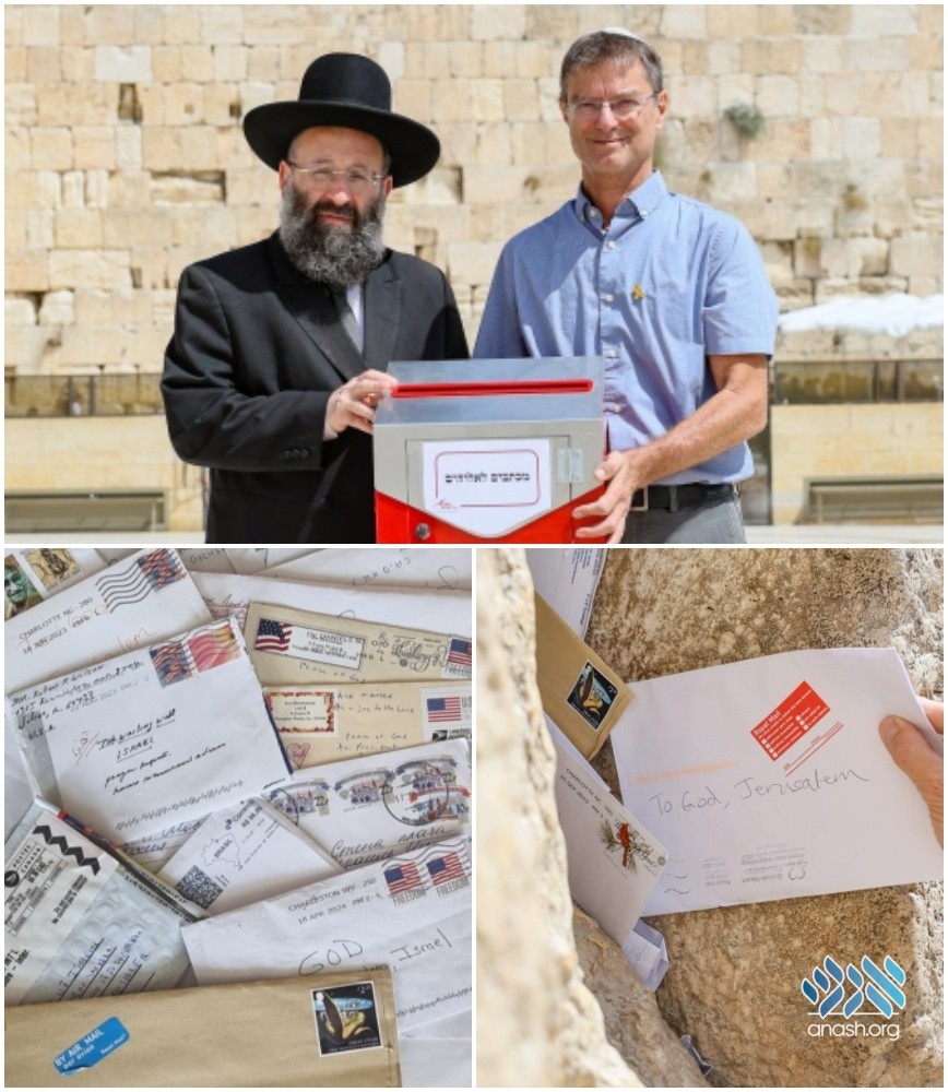 As he does every year, David Laron, CEO of Israel Post, arrived at the Kosel Plaza and handed over a collection of letters addressed to Hashem, which had been sent from around the world and collected by Israel Post over the past year (5784), to Rabbi Shmuel Rabinowitz, the rabbi of the Kosel and holy sites. The letters were given to the rabbi to be placed in the Kosel ahead of Rosh Hashana.