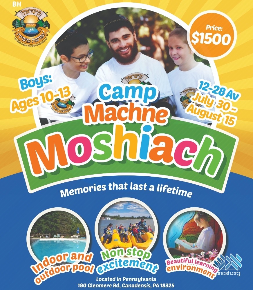 Camp Machne Moshiach of Canadensis, PA, is nestled in the beautiful Pocono Mountains. It caters to boys aged 10-13 and offers an unforgettable summer adventure from July 30 to August 15 (12-28 Av).