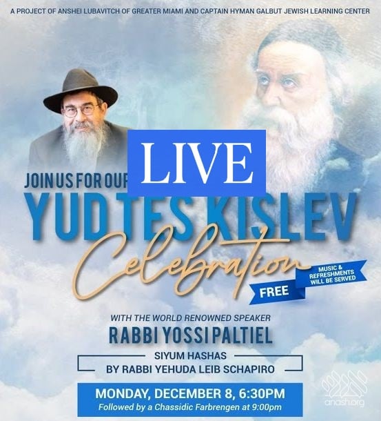 LIVE at 8:30 PM ET: Mashpia Rabbi Yossi Paltiel will be farbrenging in Miami in honor of Yud Tes Kislev.