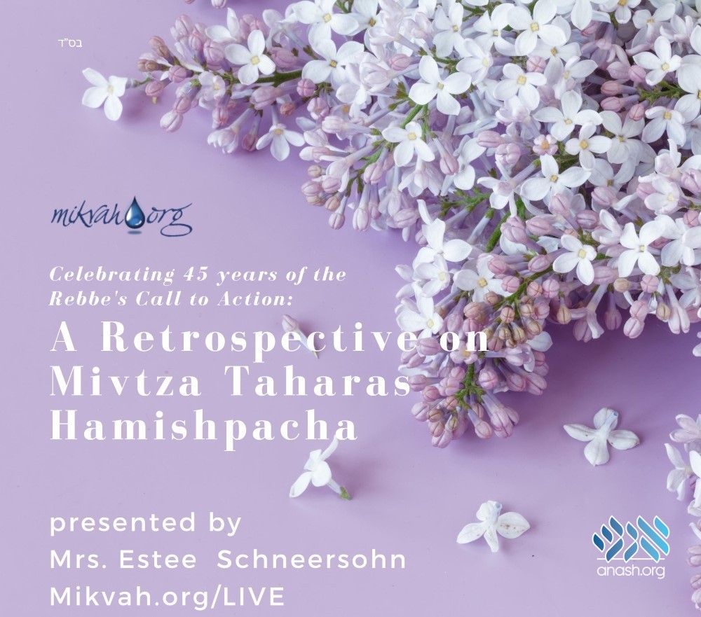 Join live at 8:00 PM ET: Mikvah.org presents a retrospective of some of the earliest activities of Mivtzah Taharas HaMishpacha presented by Mrs. Estee Schneerson.