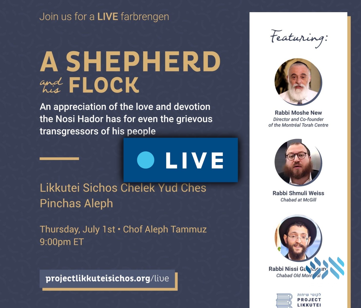 Join Live at 9:00 PM ET: Project Likkutei Sichos presents a live farbrengen on the weekly sicha with Rabbis Moshe New, Shmuli Weiss, and Nissi Gansbourg.