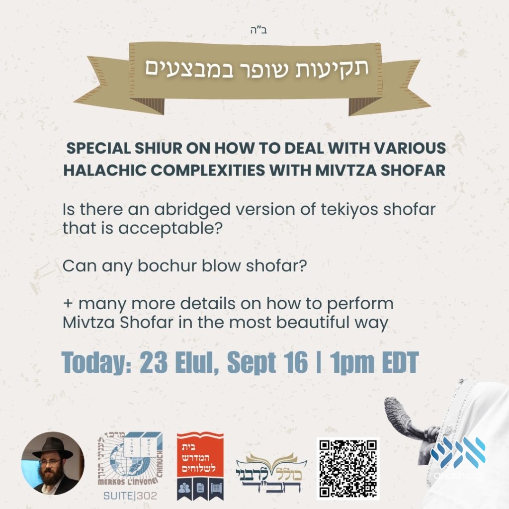 Live at 1:00 PM: Kollel L’Rabbonei Chabad invites you to a special live shiur on Hilchos Rosh Hashana by HaRav Chaim Hillel Raskin on the background and source material for how to fulfill mivtza shofar in the optimal way and what to do on mivtzoim.