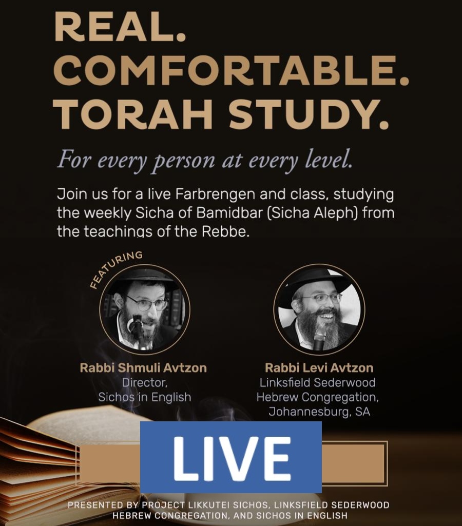 Join Live at 9:00 pm ET: Brothers Rabbi Shmuli Avtzon of Sichos in English and Rabbi Levi Avtzon of Johannesburg, SA will teach the Rebbe’s sicha and farbreng.