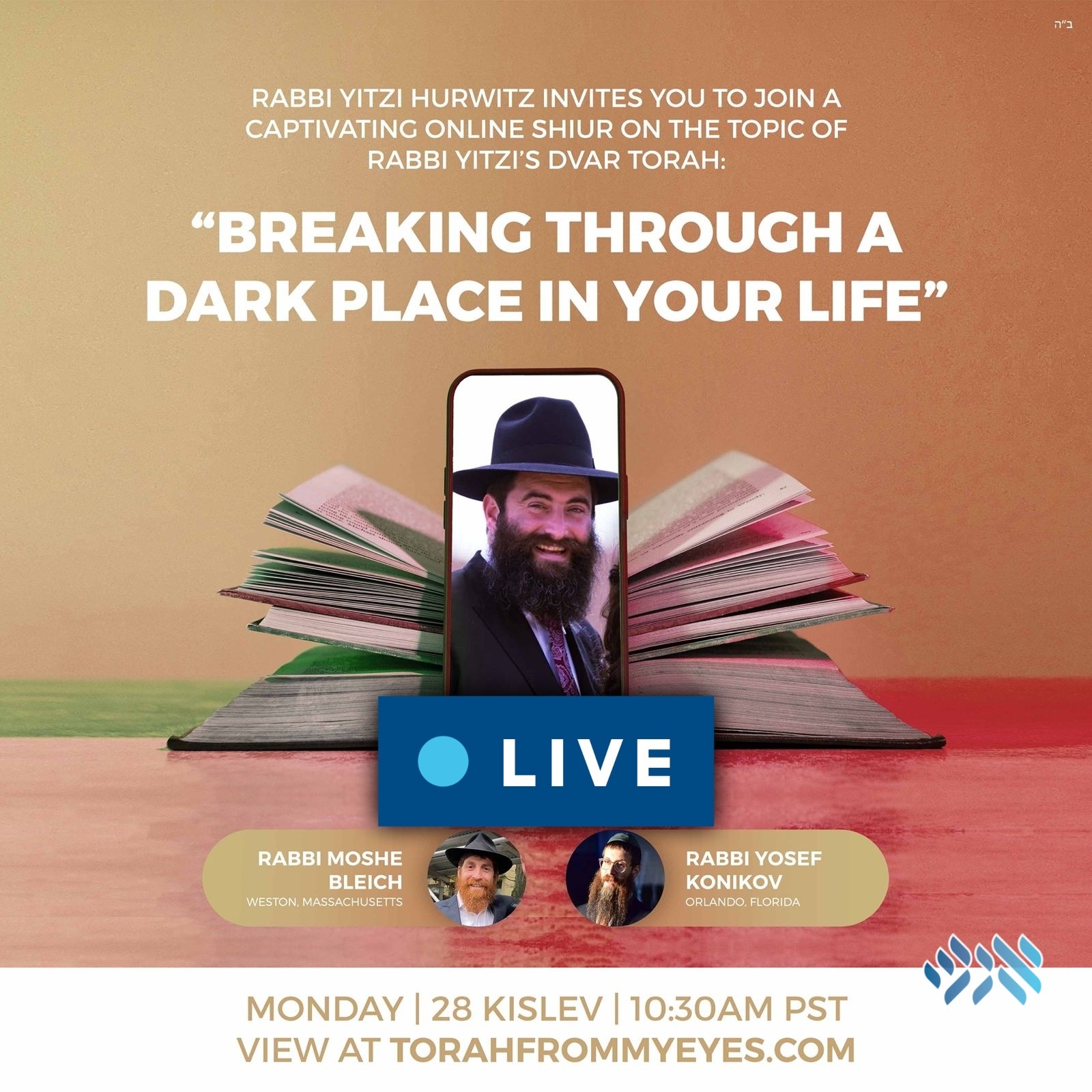 In honor of Chanukah, two of Rabbi Yitzi’s friends, Rabbi Yosef Konikov and Rabbi Moshe Bleich, will farbreng with Rabbi Yitzi at 1:30 Eastern.
