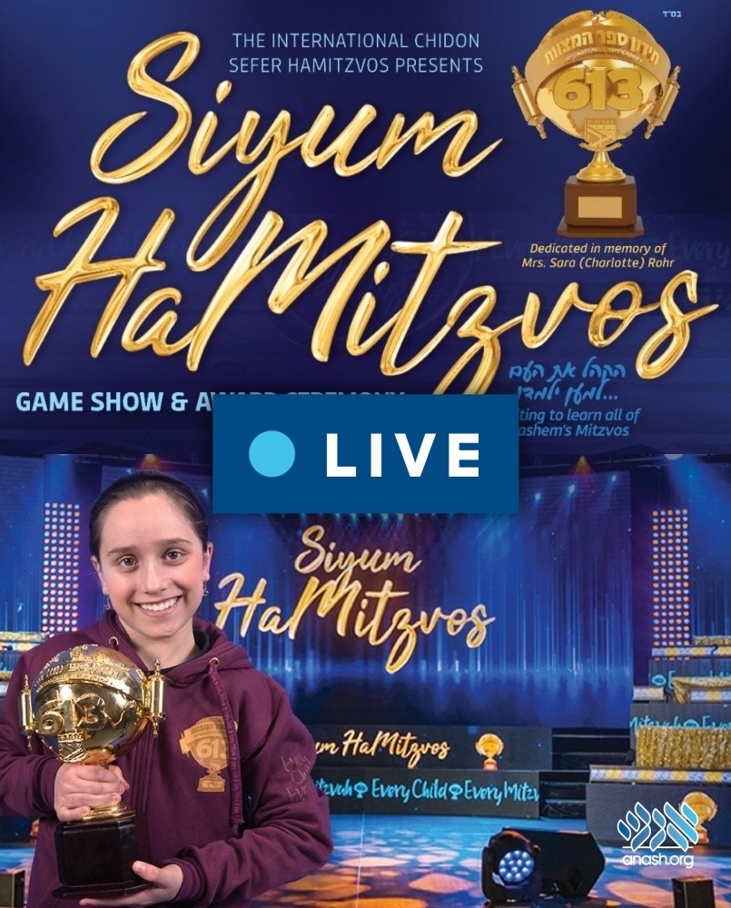 Join Live Today at 1:45 PM: The International Chidon Hamitzvos Grand Finale will stream live, celerating the completion of studying all 613 mitzvos with a exciting game show and award ceremony, together with a concert by Benny Friedman and Eli Marcus!