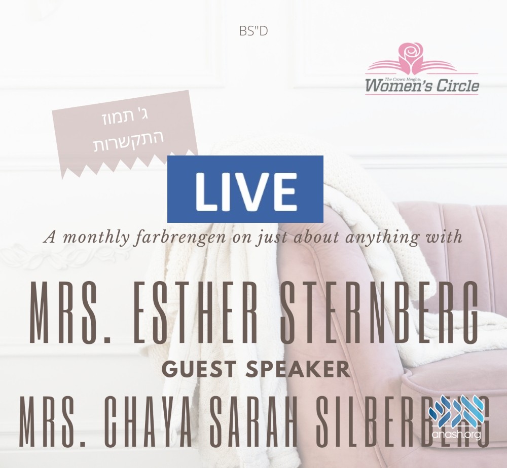 Join Live at 8:30 PM ET: Crown Heights Women’s Circle monthly ‘Conversations with Mrs. Esther Sternberg‘ will featuring guest speaker Mrs. Chaya Sarah Silberberg and will be discussing the topic of hiskashrus.