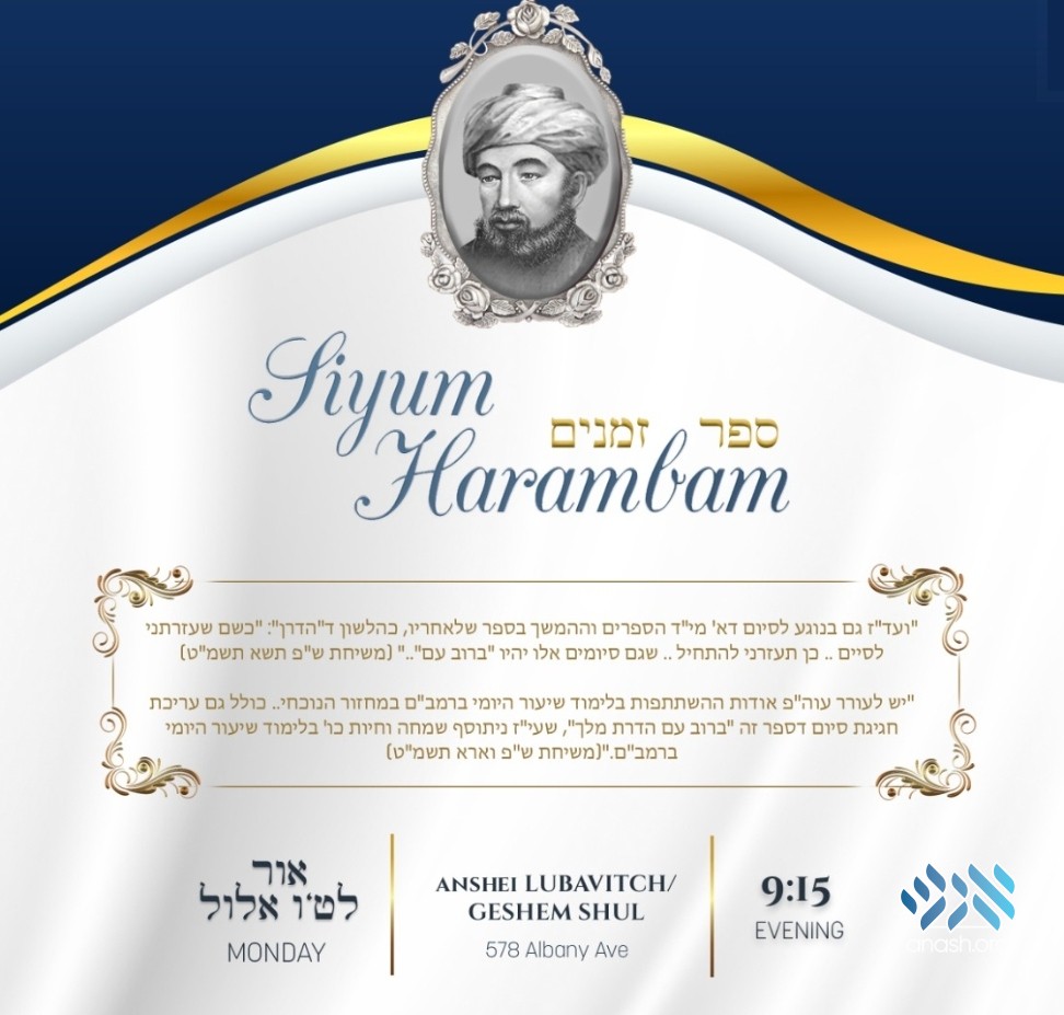 Join Live Now: A Siyum Harambam is taking place at the Anshei Lubavitch/Geshem Shul in Crown Heights, celebrating the completion of Sefer Zmanim, with the participation of Magidei Shiurim from local Rambam shiurim.