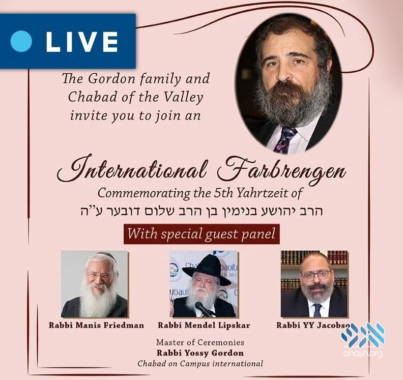 An online farbrengen will mark the 5th yahrzeit of beloved shliach Rabbi Yehoshua Binyomin Gordon, founder and executive director of Chabad of the Valley in Southern California.