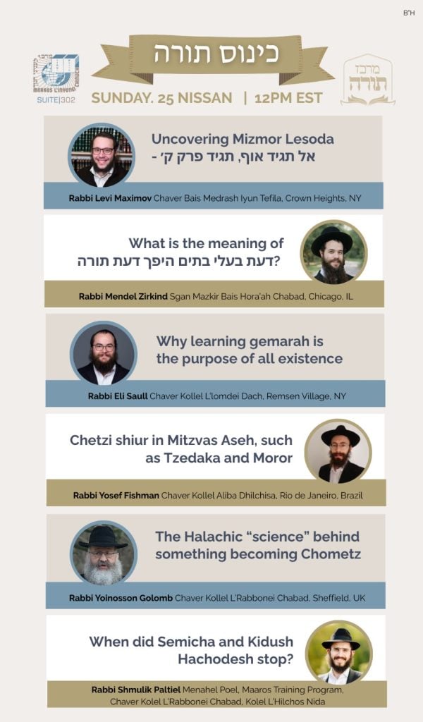 Join Live at 12 PM: Members of Merkos Torah kollelim will discuss fascinating Torah topics, following the Rebbe’s directive to hold Torah gatherings around Yom Tov.