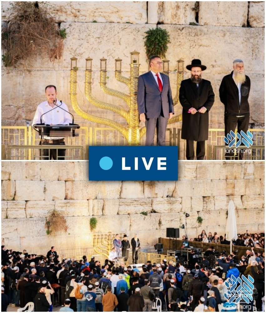 Watch live at 9:00 AM EST: The first candle of Chanuka will be lit at the Kosel Plaza, the site closest to the where the miracle of Chanuka took place. 138 smaller menorahs will be lit for the Hamas captives.