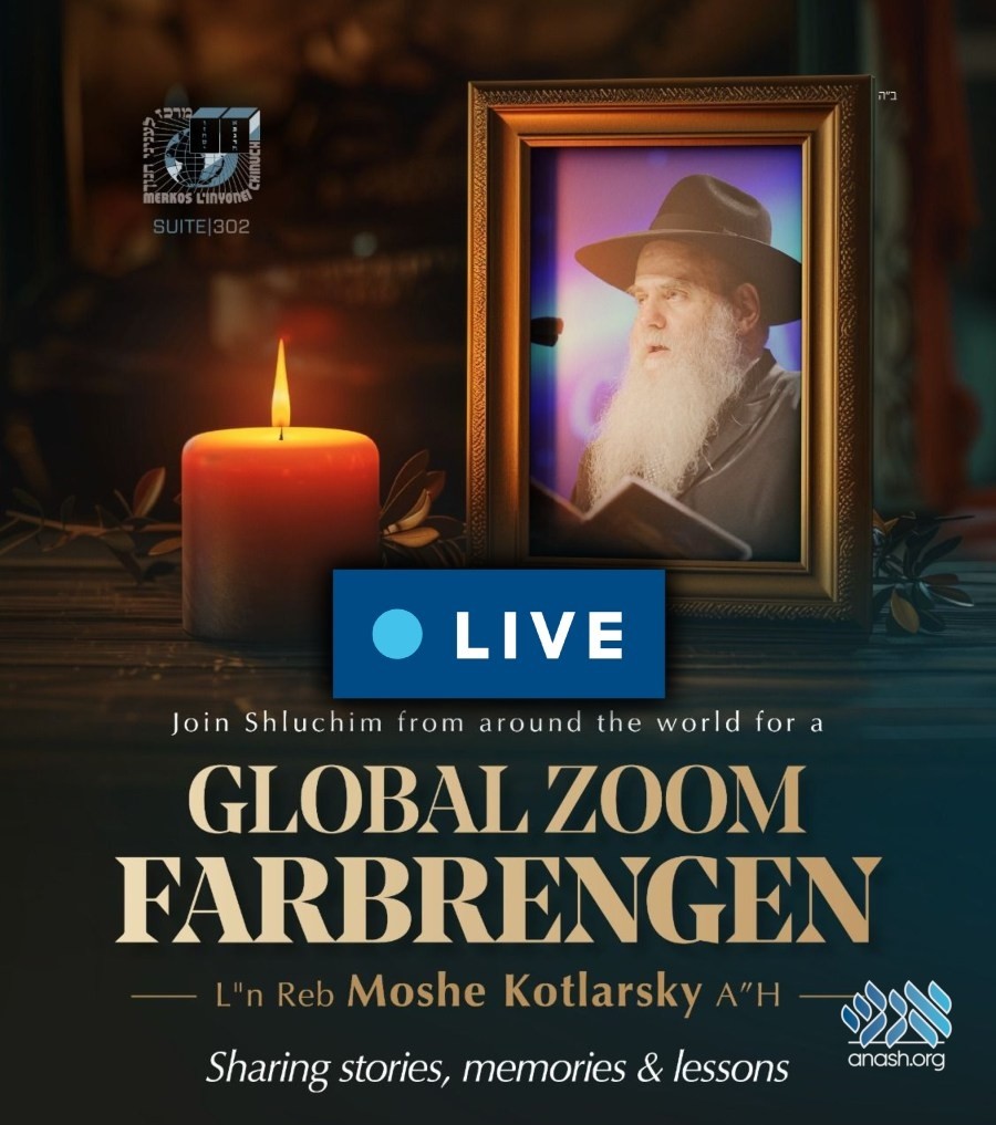 Live in English at 5:00 PM ET: A global farbrengen will be held on Zoom in honor of R’ Moshe Kotlarsky AH. Shluchim will share memories, stories, and lessons from this worldwide shliach.