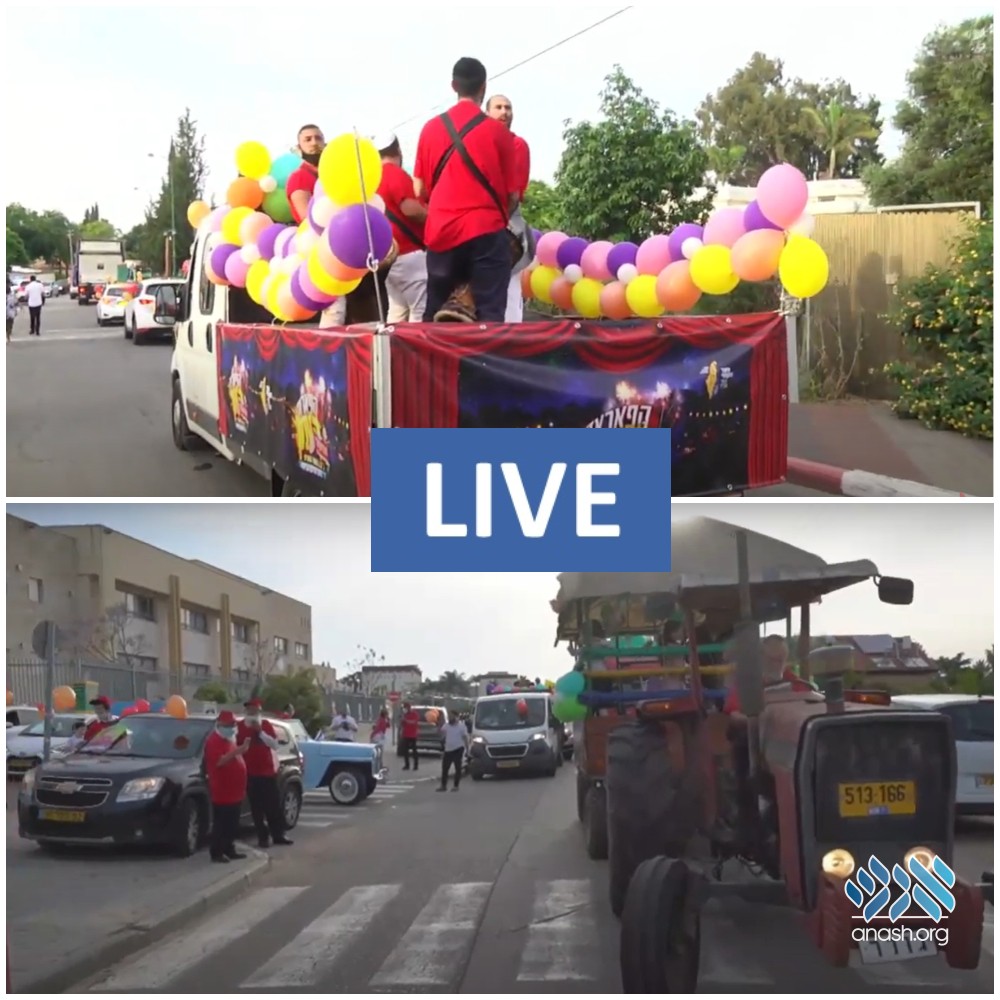 Watch a live feed of the Lag B’Omer parade taking place now in Kfar Chabad, featuring singer Simcha Friedman and Elor Velner alongside traditional floats and dozens of vehicles with fun displays.