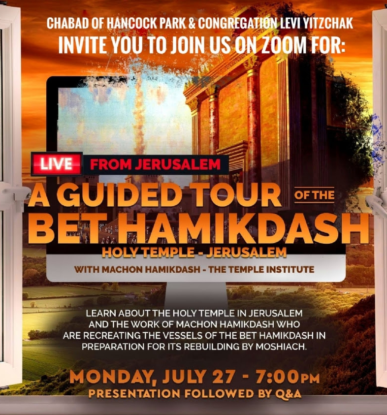 Chabad of Hancock Park and Congregation Levi Yitzchak of Los Angeles present A Guided Tour of the Beis Hamikdash, Live from Yerushalayim.