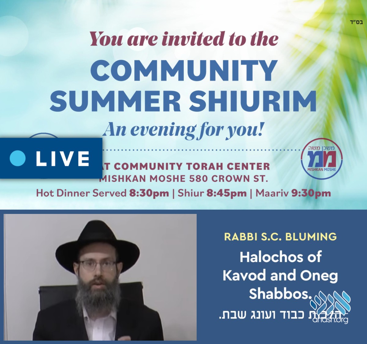 Join Live Now: Rabbi Shmuel Chaim Bluming will speak at the community summer shiurim, on the topic of ‘Halachos of Kavod and Oneg Shabbos.’