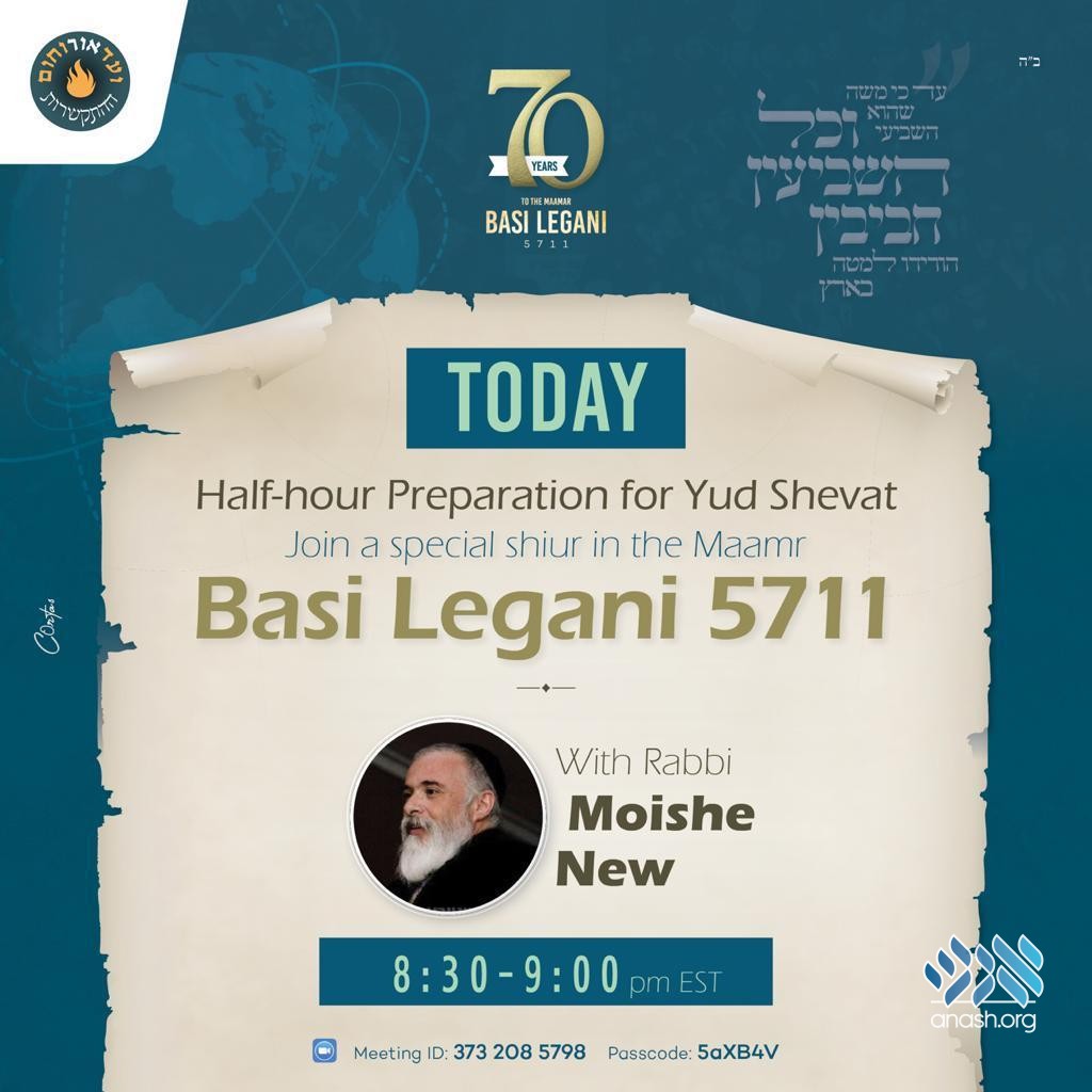 Join Live Now: Rabbi Moshe New will deliver a shiur in Basi Legani 5711, the Rebbe’s first ma’amar.