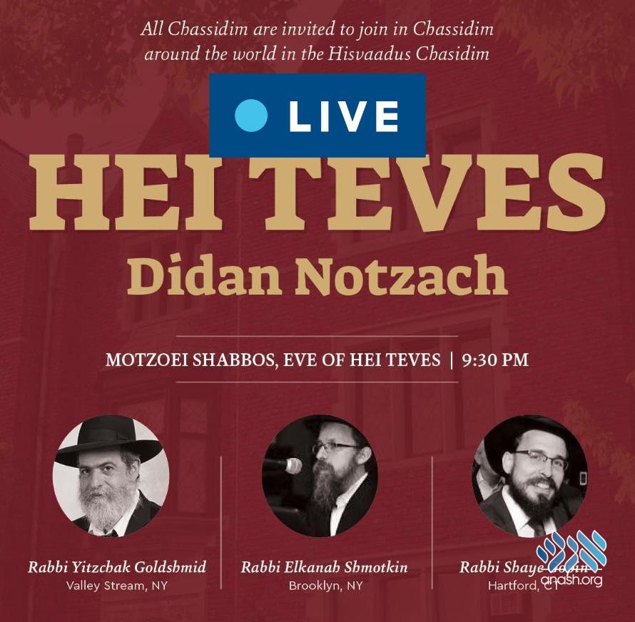 Join Live Motzei Shabbos at 9:30 PM ET: A farbrengen celebrating Hey Teves- Didan Notzach will be broadcast live from the Ohel, addressed by Rabbis Yitzchak Goldshmid, Elkanah Shmotkin and Shaya Gopin.