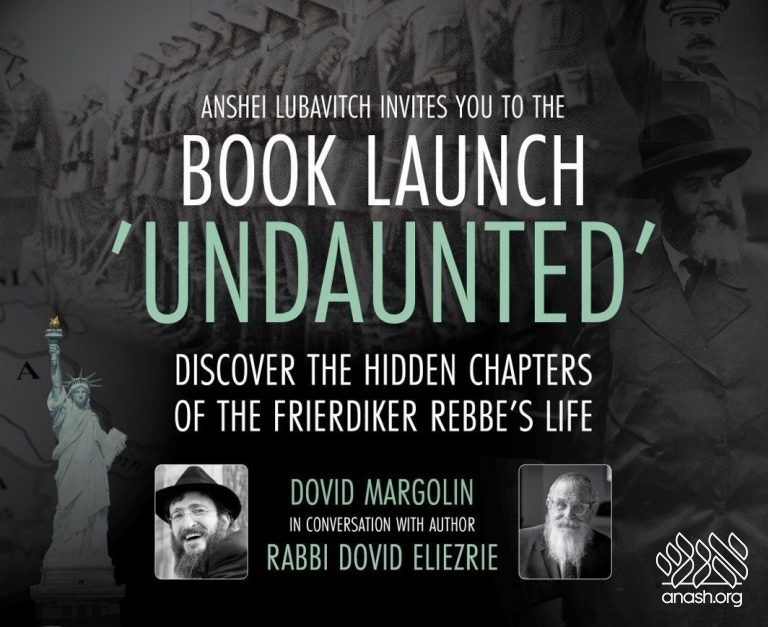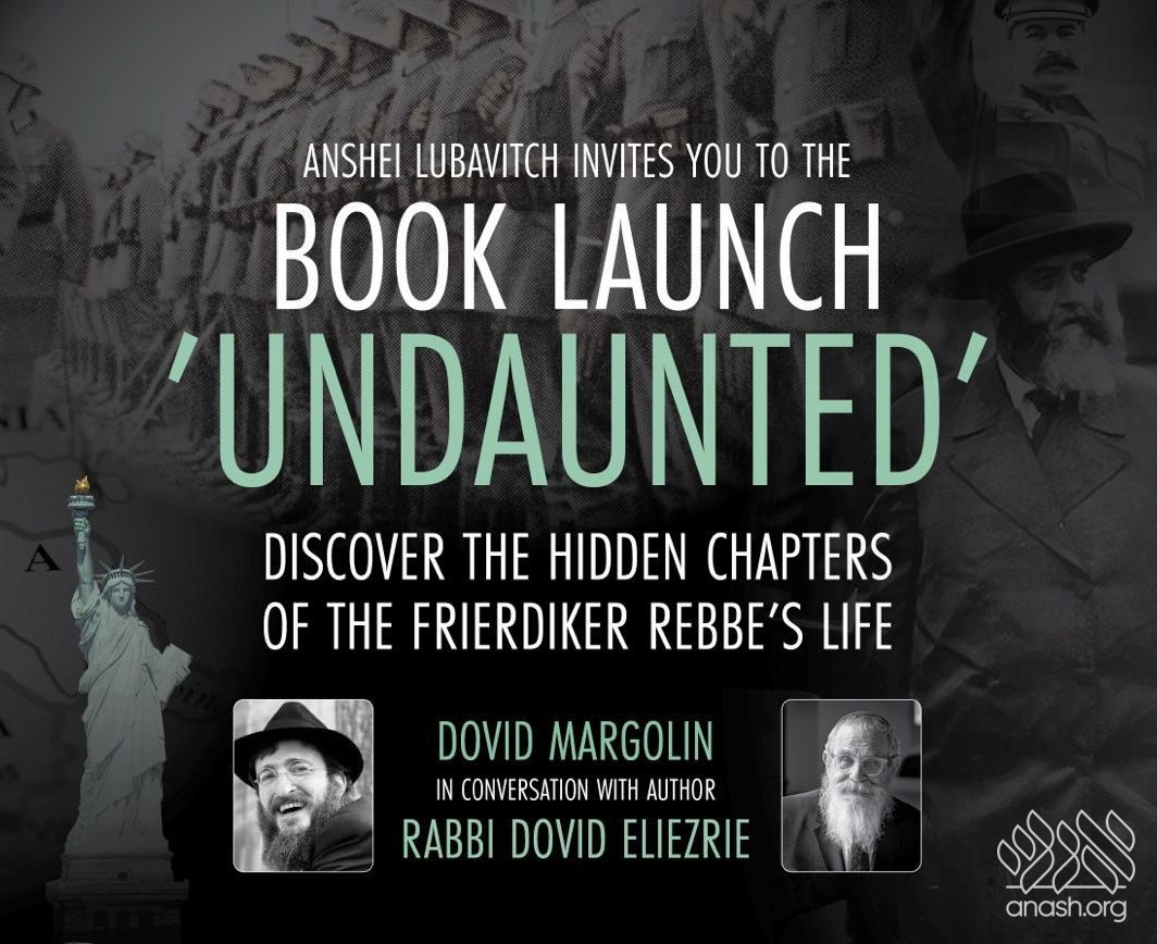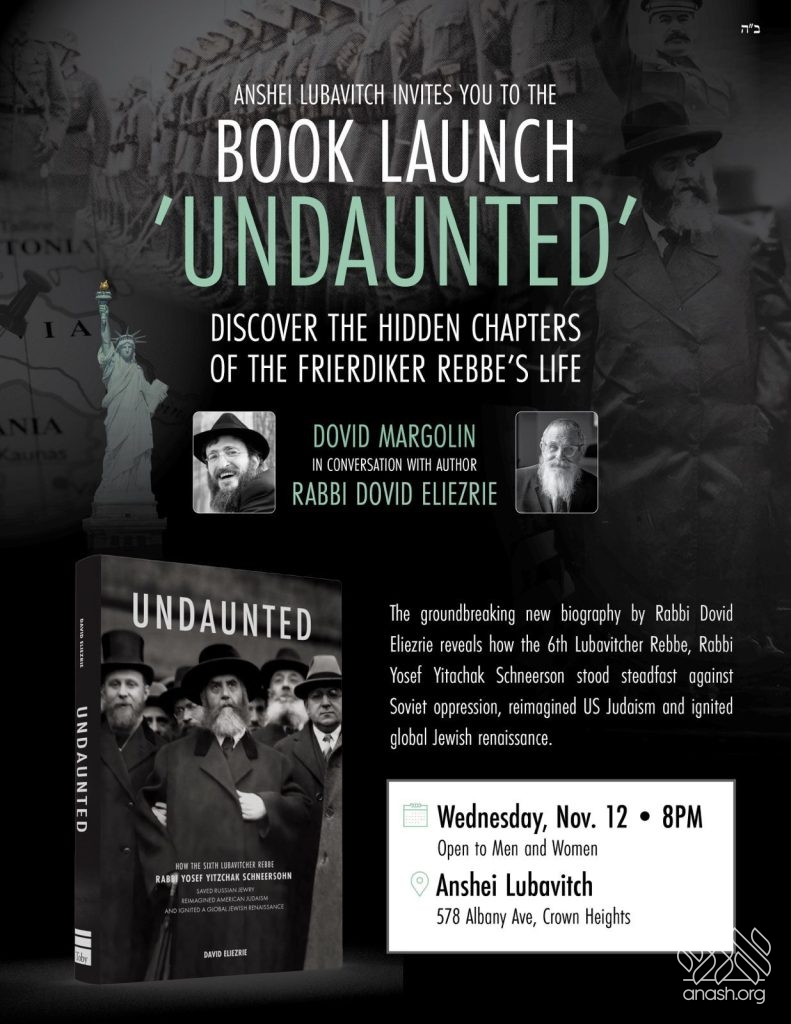 Anshei Lubavitch in Crown Heights will host the official book launch of Undaunted, the groundbreaking new biography by Rabbi Dovid Eliezrie, today (Wednesday) at 8:00 PM. The event will feature a conversation between the author and Dovid Margolin, senior editor at Chabad.org, exploring the hidden and heroic chapters of the Frierdiker Rebbe’s life.