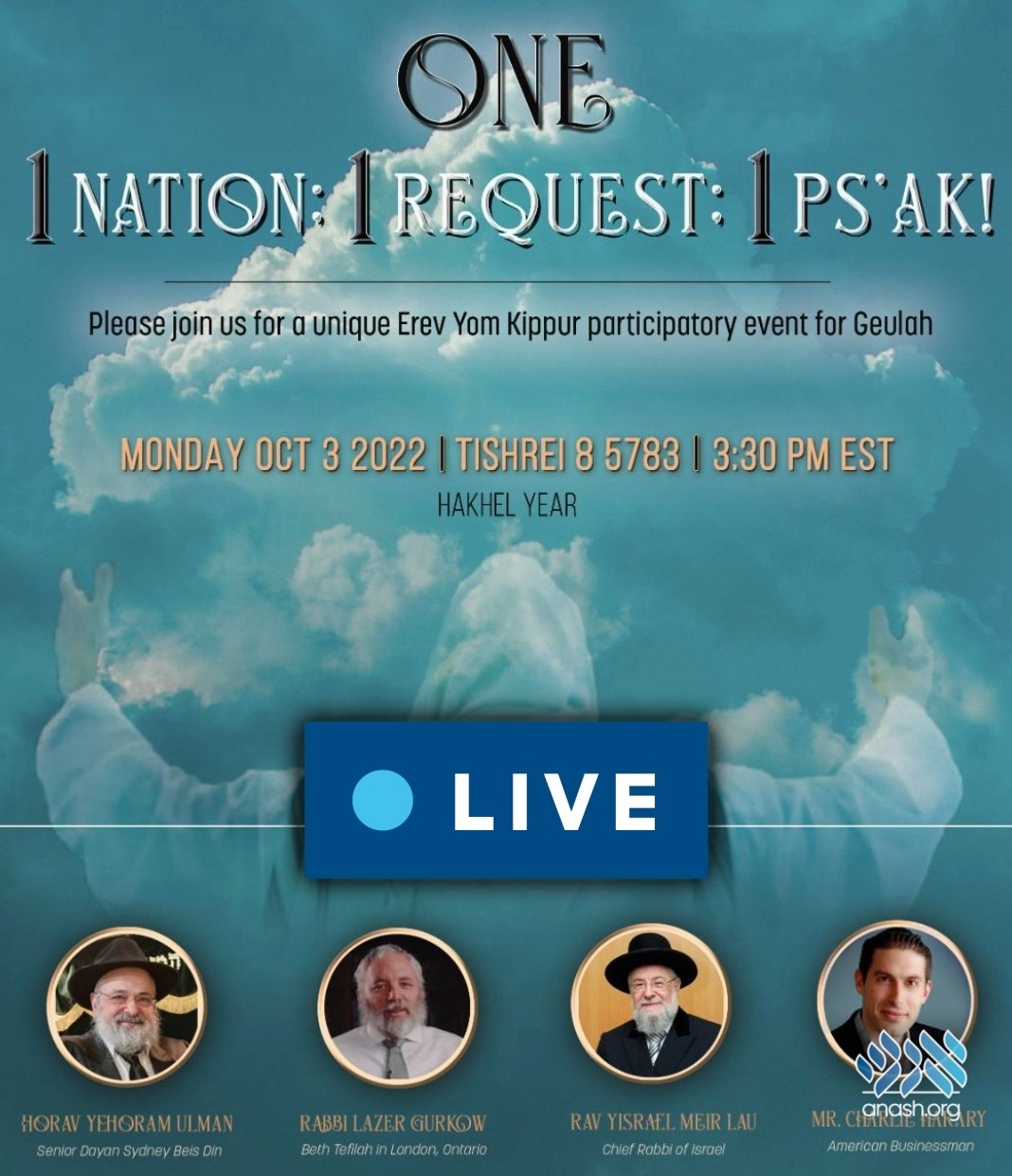 Live at 3:30 PM ET: A historic global gathering will unite Jews around the world to daven for the Geulah ahead of Yom Kippur, featuring Rabbis Yisroel Meir Lau, Laizer Gurkov, Yehoram Ulman, and Mr. Charlie Harari.