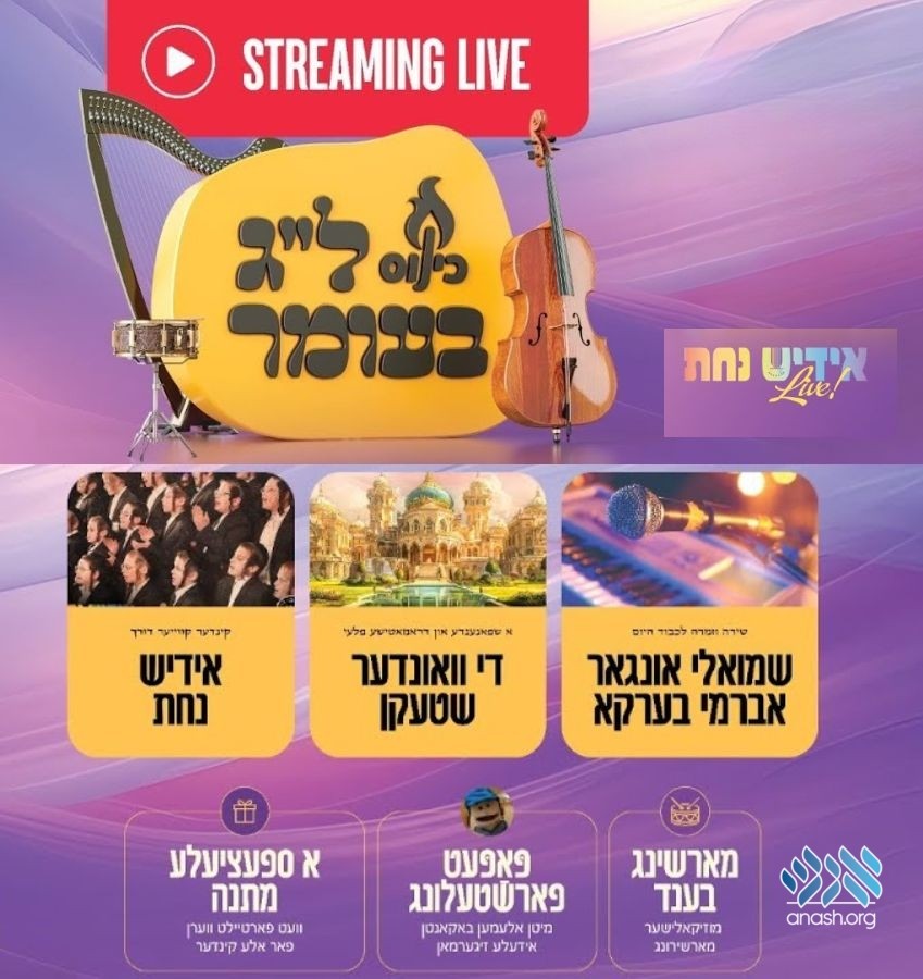 The program includes the recitation of the 12 Pesukim, an uplifting musical performance by singer Shmueli Ungar accompanied by the Yiddish Nachas Choir and Avrumi Berko music.