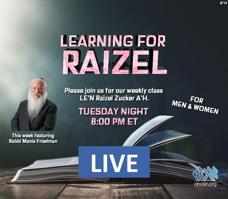 Join Live at 8:00 PM ET: A weekly class founded in memory of Raizel Zucker will feature Rabbi Manis Friedman this week.