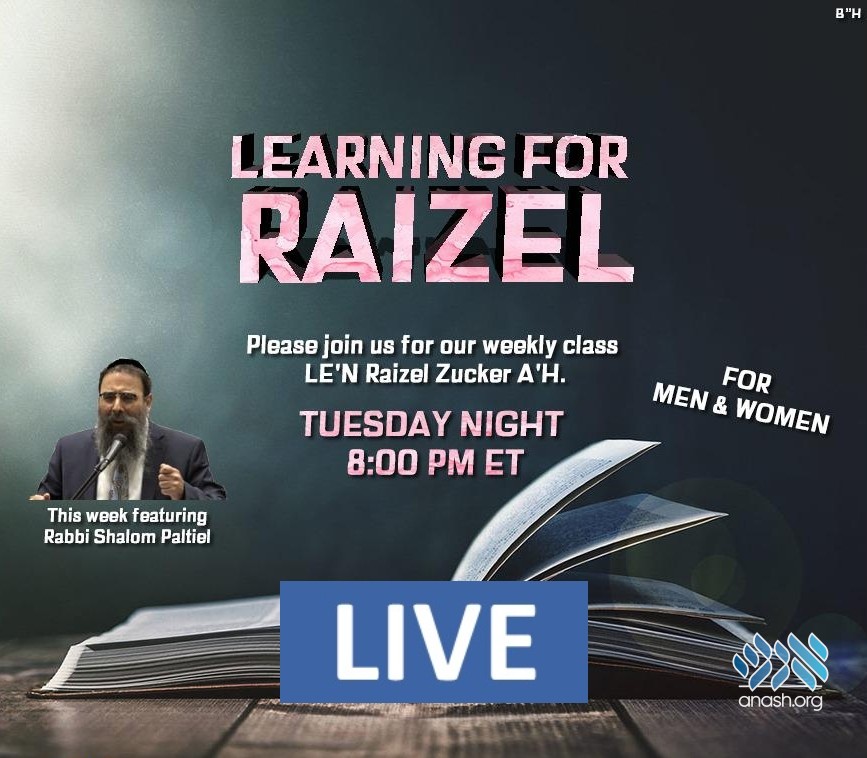 Join Live at 8:00 PM ET: A weekly class founded in memory of Raizel Zucker will take place tonight, featuring Rabbi Sholom Paltiel.