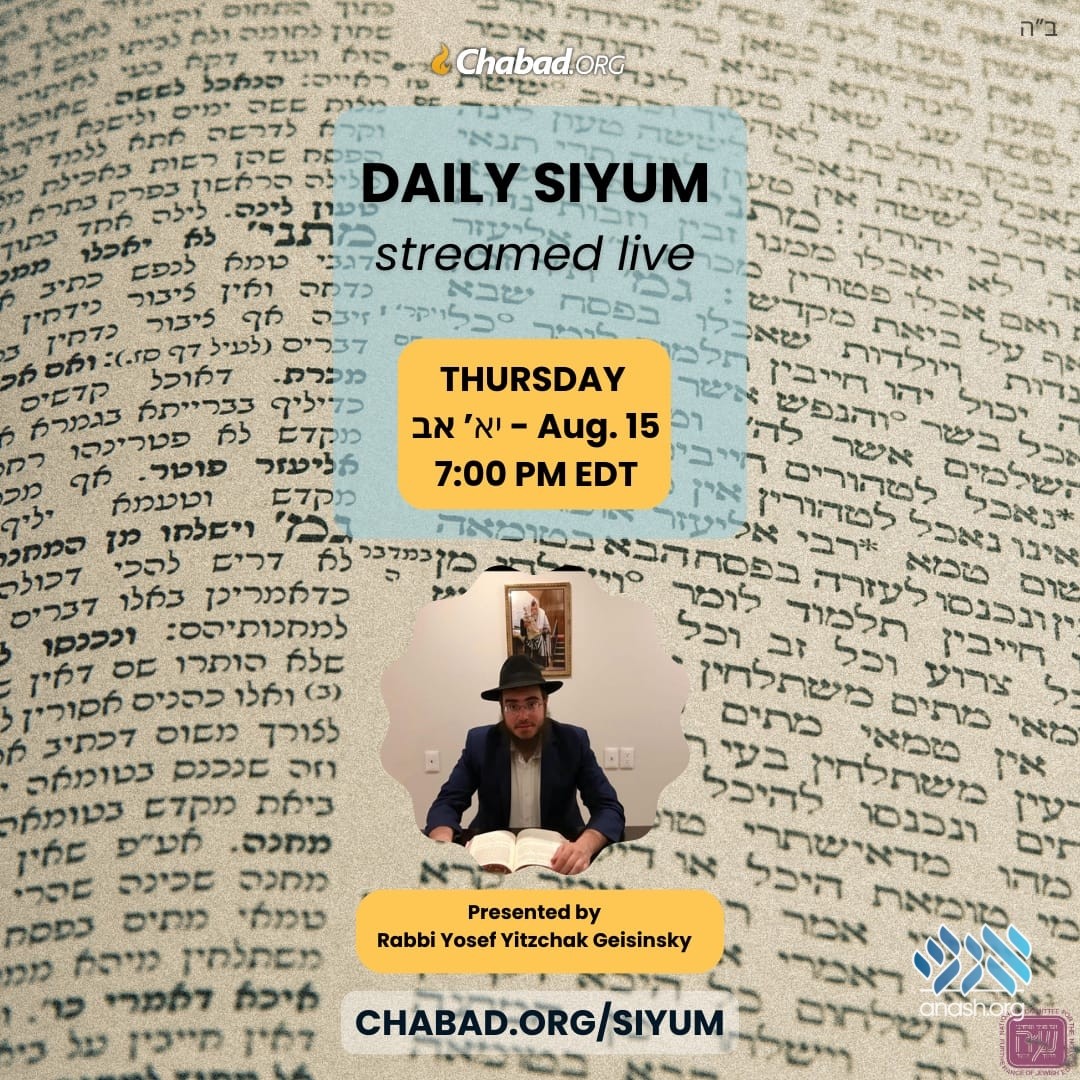 Live at 7:00 PM: Following the Rebbe’s instruction to hold siyumim daily, a live siyum will be broadcast by Rabbi Yosef Yitzchak Geisinsky, Magid Shiur at Yeshivas Achei Tmimim and Hadar Hatorah, on masechta Sukkah.