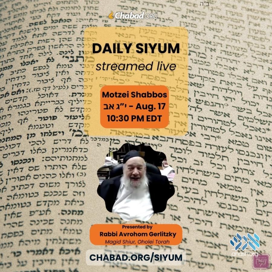 Live at 10:30 PM: Following the Rebbe’s instruction to hold siyumim daily, a live siyum will be broadcast by Rabbi Avrohom Gerlitzky, Magid Shiur in Beis Midrash Oholei Torah, on Masechta Horayos.