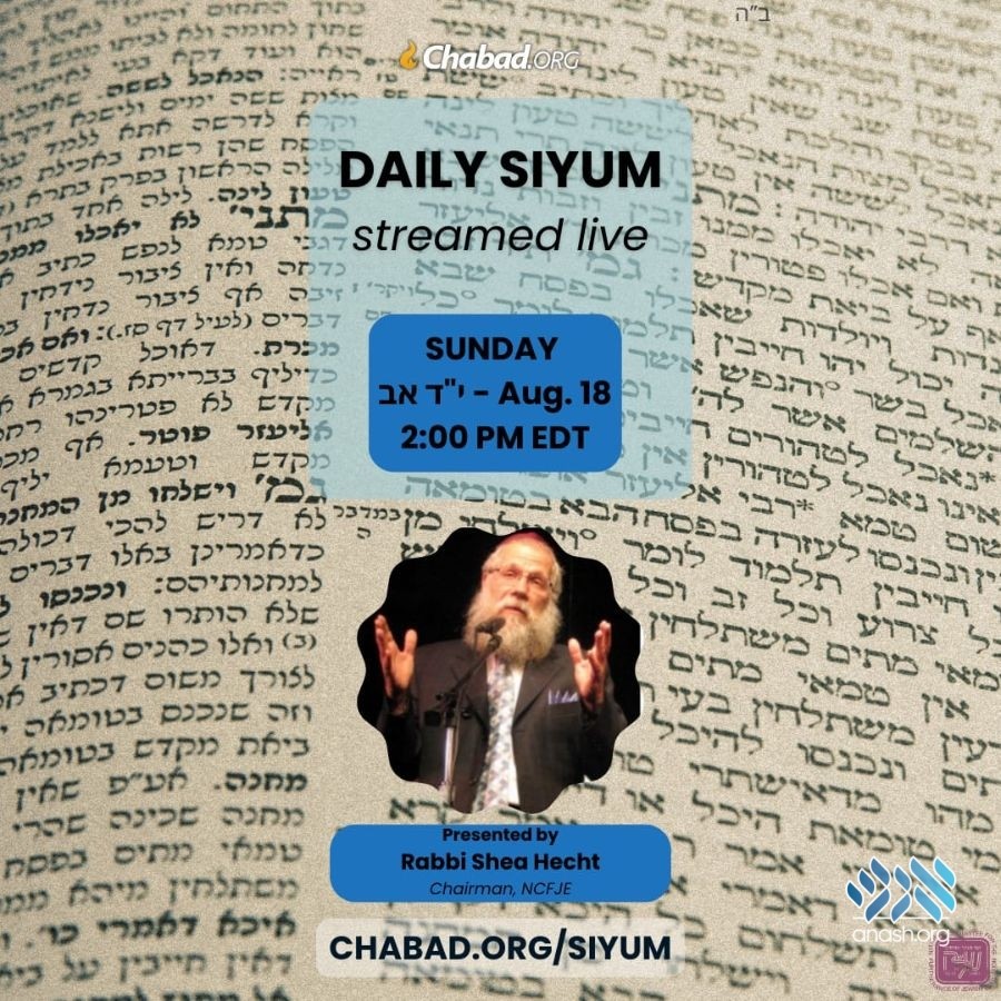 Live at 2:00 PM: Following the Rebbe’s instruction to hold siyumim daily, a live siyum will be broadcast by Rabbi Shea Hecht, Chairman of NCFJE, on masechta Middos.