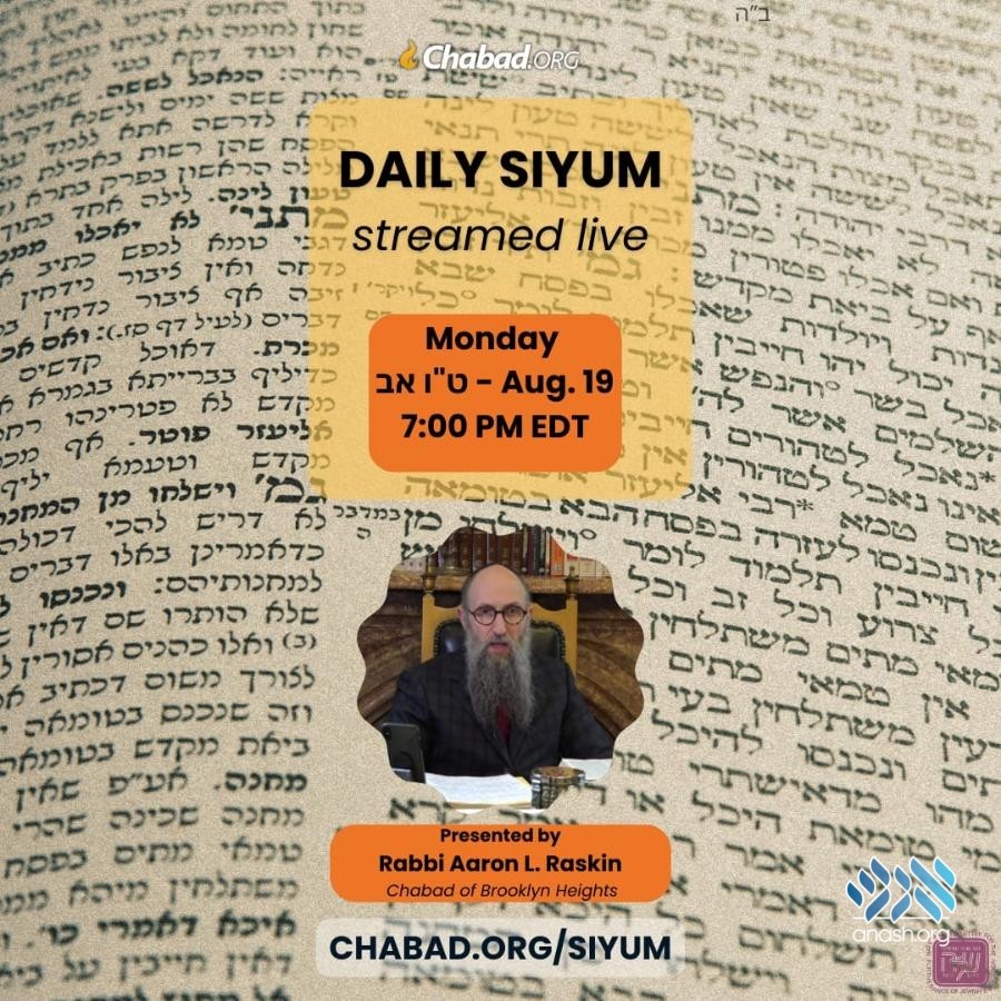 Live at 7:00 PM: Following the Rebbe’s instruction to hold siyumim daily, a live siyum will be broadcast by Rabbi Aaron L. Raskin, Chabad of Brooklyn Heights, on masechta Brachos.