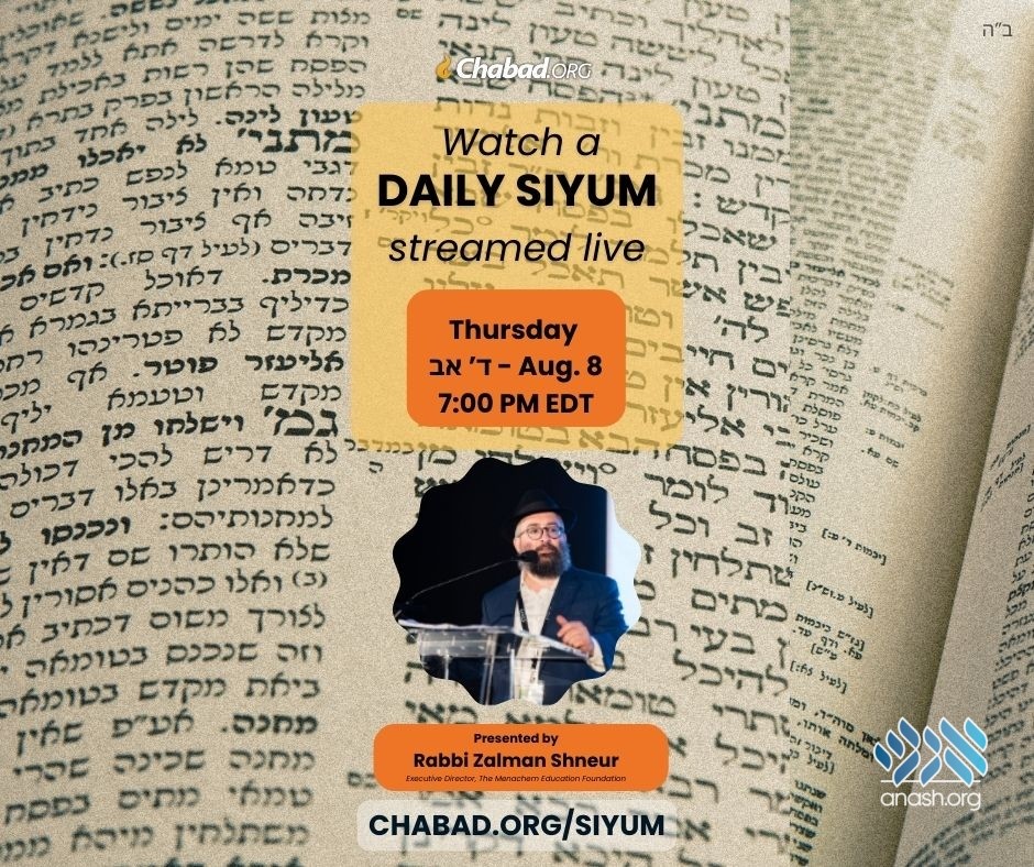 Live at 7:00 PM: Following the Rebbe’s instruction to hold siyumim daily, a live siyum will be broadcast by Rabbi Zalman Shneur, executive director of the Menachem Education Foundation, on masechta Eruvin.