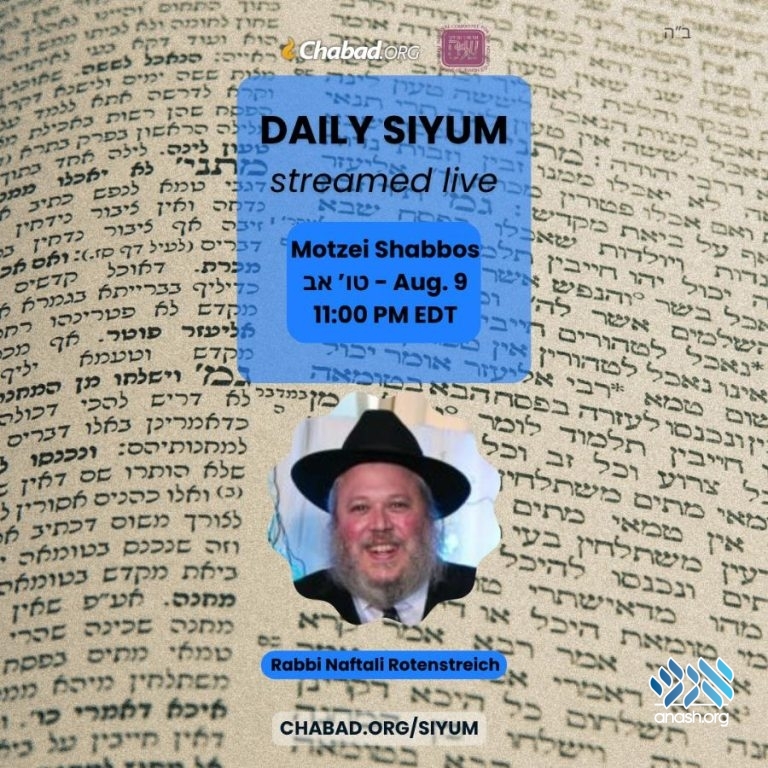 Live at 11 PM: Following the Rebbe’s instruction to continue daily siyumim until the 15th of Av, a live siyum will be broadcast by Rabbi Naftali Rotenstreich on Maseches Zevachim.