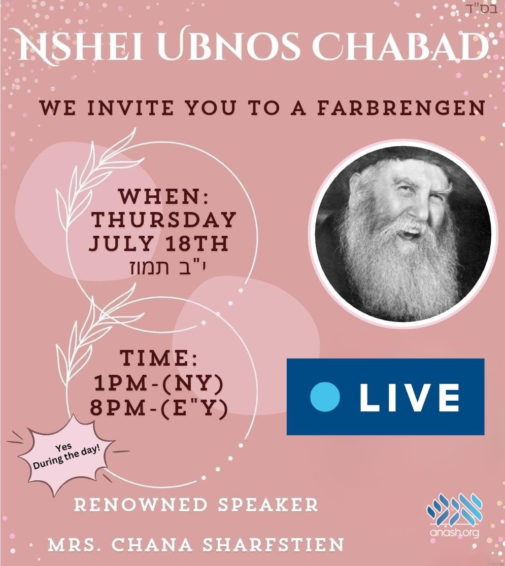 In honor of י״ב – י״ג תמוז a unique and empowering farbrengen is organized for women from all corners of the globe. Mrs. Chana Sharfstein has been invited to lead this extraordinary initiative over Zoom.