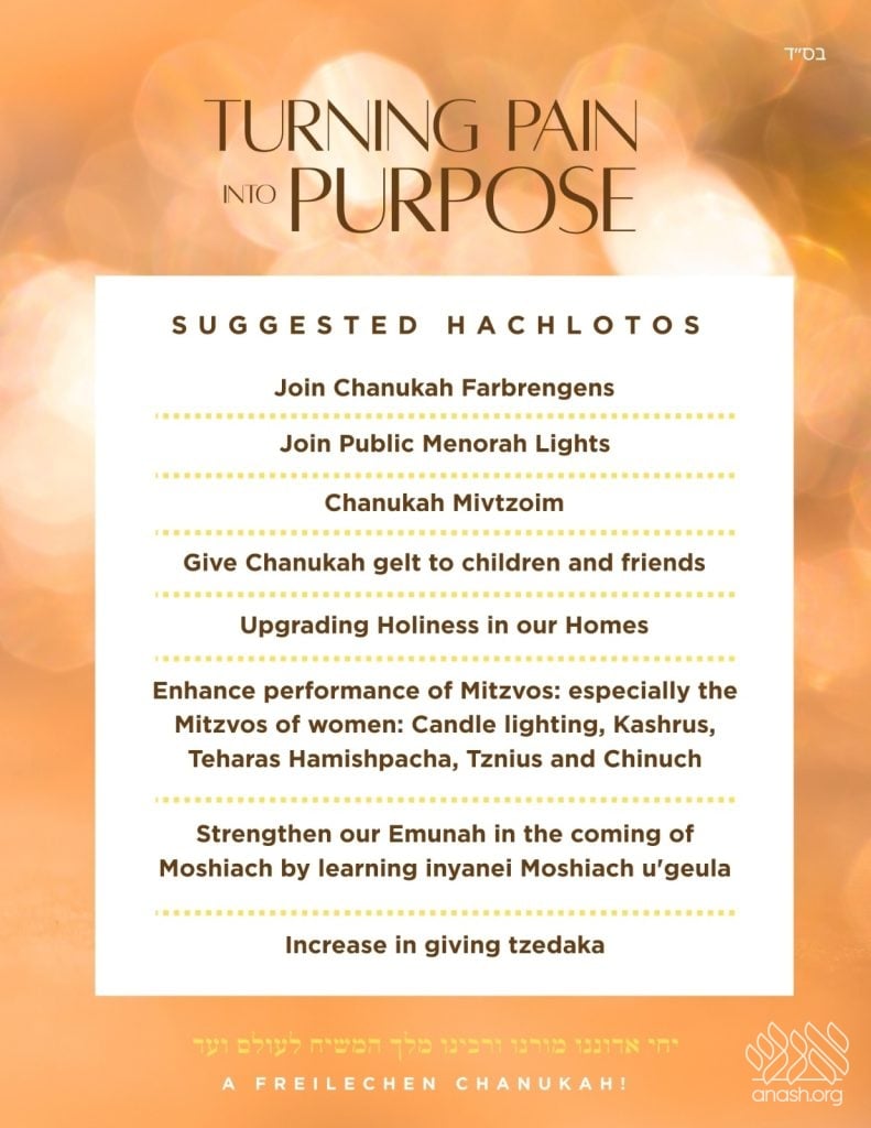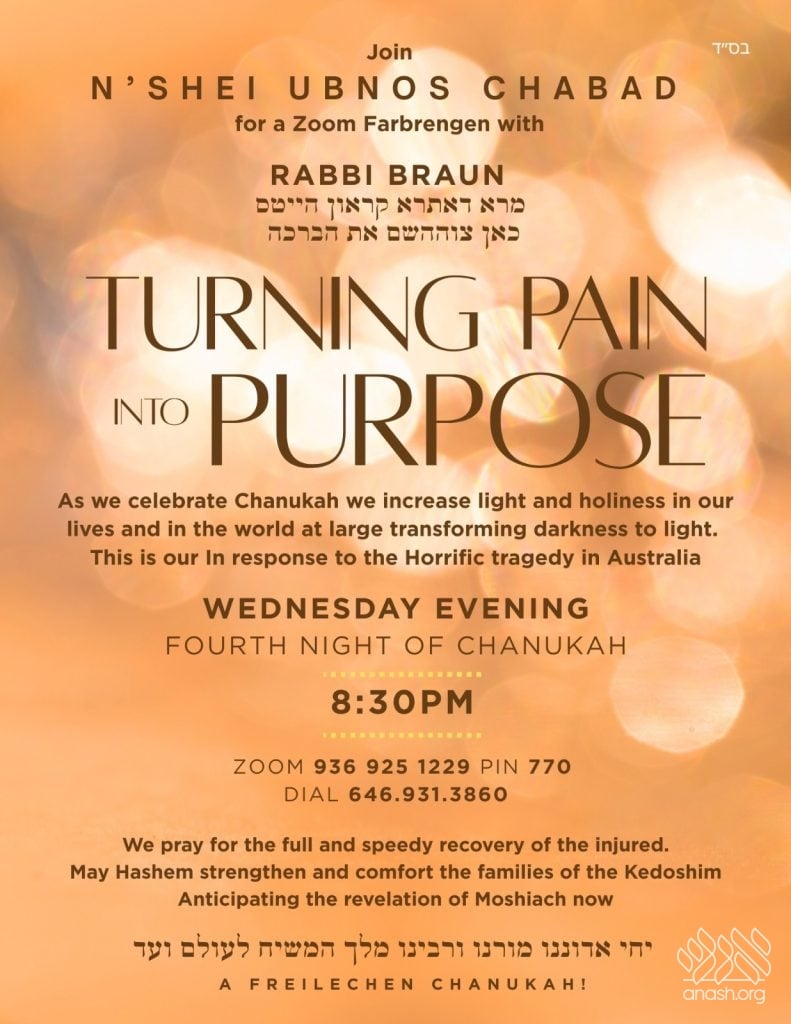 In response to recent tragic events and in the spirit of Chanukah, N’shei Ubnos Chabad will host a global Zoom farbrengen titled “Turning Pain Into Purpose” on Wednesday evening, the fourth night of Chanukah, at 8:30 PM.
