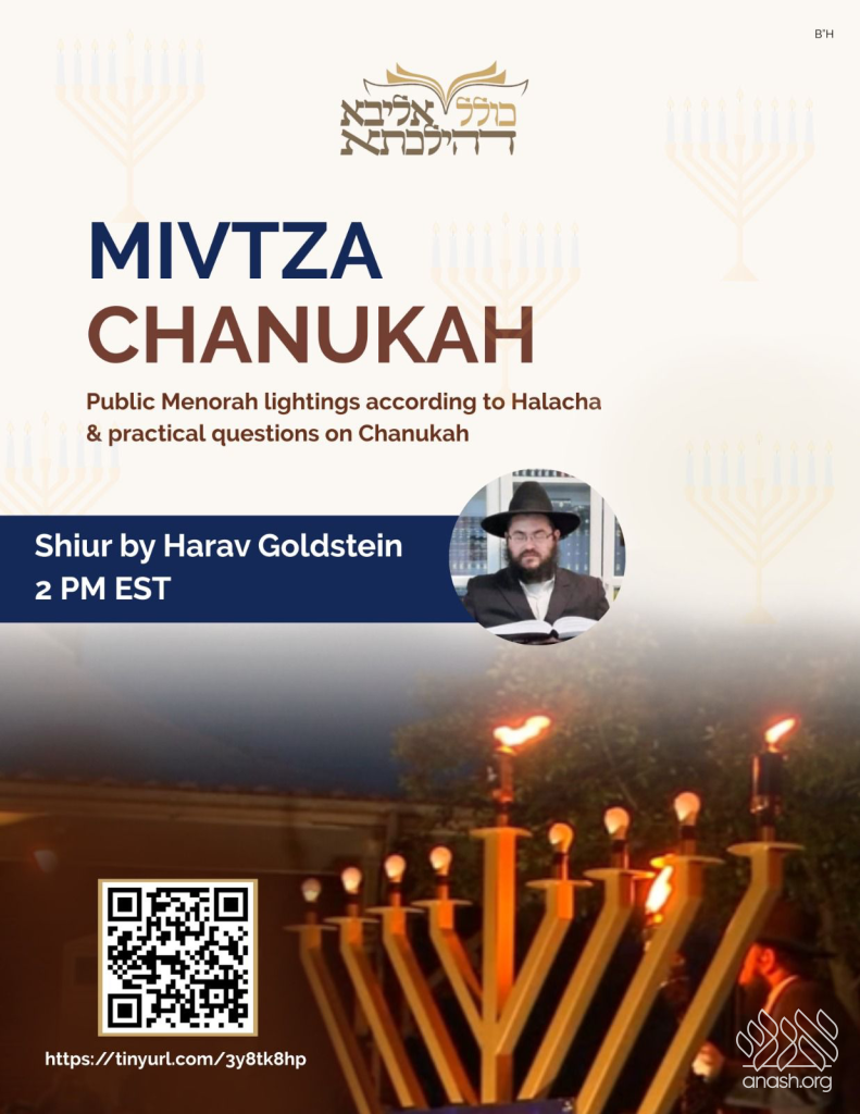 Live at 2:00 PM ET: A shiur on public menorah lightings according to halachah and other practical questions on Chanukah will be given by Rabbi Yaakov Goldstein, Rosh Kollel of Kollel Aliba D’Hilchasa.