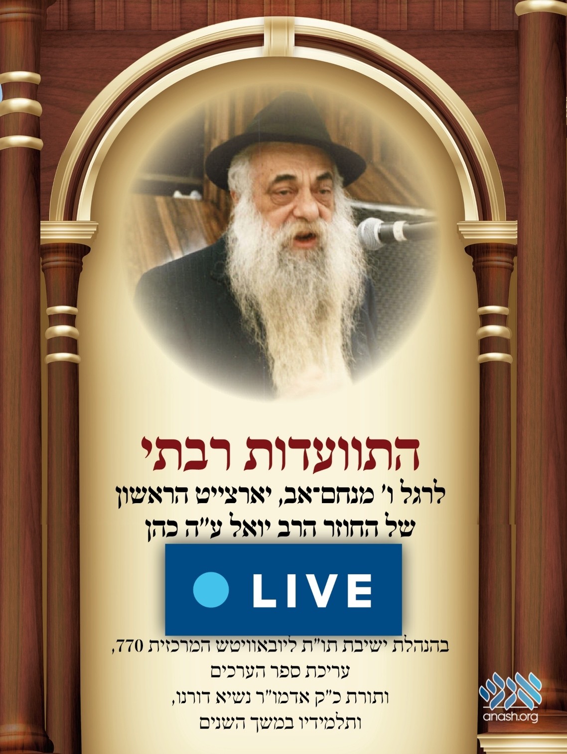 Live at 8:00 PM ET: A kinus Torah on topics of the Beis Hamikdash and a farbrengen in Crown Heights will mark the first yahrzeit of Reb Yoel Kahn, legendary teacher of Chassidus and the Rebbe’s chozer.