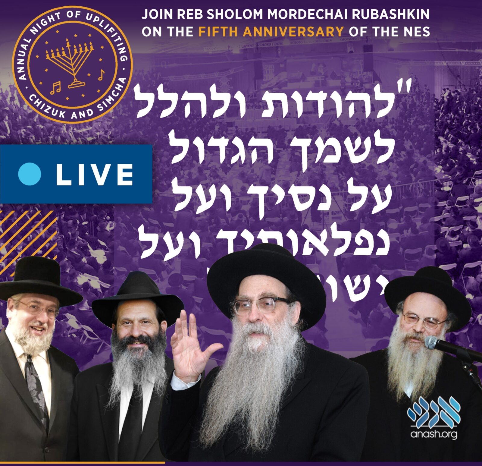 As in years past, Zos Chanukah this year will be marked with an evening of thanksgiving – an expression of Hoda’ah, Simcha, and Chizuk of Emunah and Bitachon – celebrating the fifth anniversary of the miraculous release of R’ Sholom Mordechai Rubashkin from a place called prison on Zos Chanukah 5778.